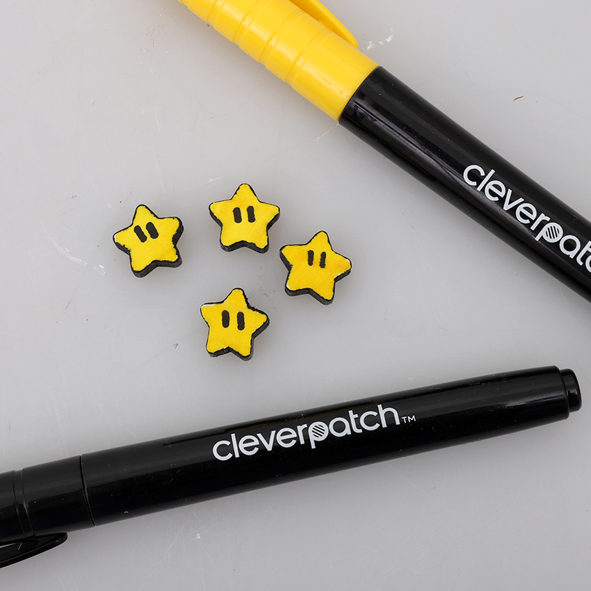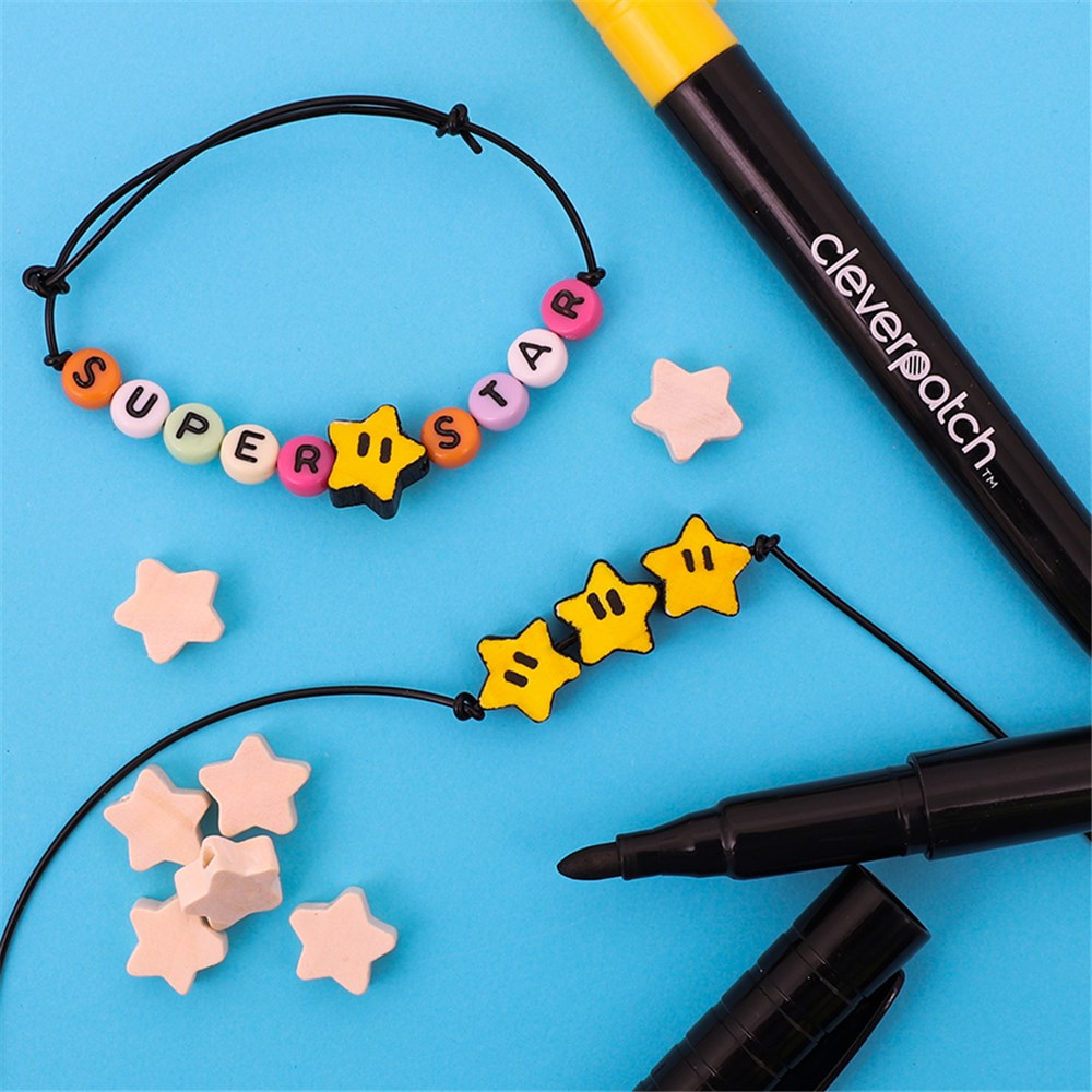 • Step 1Start by creating your ‘Super Star’ beads using permanent markers to colour in the Wooden Star Beads. Colour the edges black then the face of the bead yellow and finish by adding some black eyes. Think about the design you are wanting to create so you know how many stars you’re going to need.