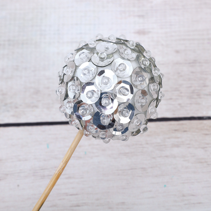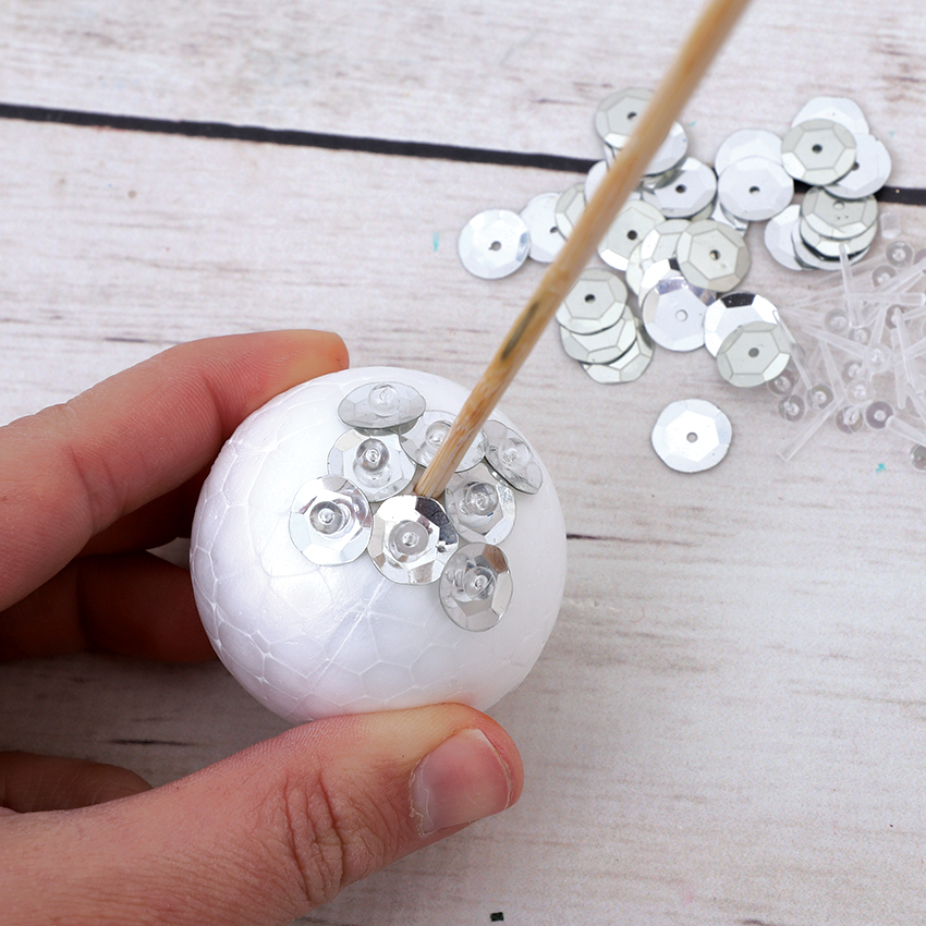 • Step 3Continue adding sequins until the decofoam ball is completely covered.
