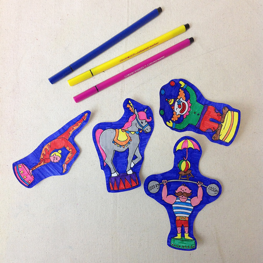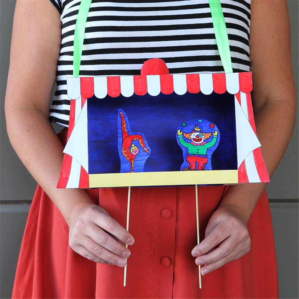 • Step 6Print and colour in the BLMs provided of circus performers then cut them out. Attach wooden skewers to the back of each template with sticky tape so you can hold them up inside your circus tent. Your Circus Puppet Box is now ready to put on a show!