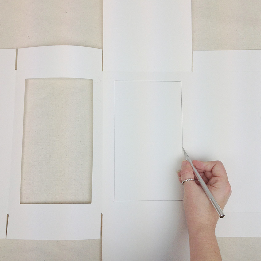 • Step 1Lay your diorama box out flat. On the side next to the piece with the cut out (this should be the bottom of the box once constructed), draw a rectangle that is 2cm in from each edge. Cut the rectangle out using a hobby knife. Adult supervision is recommended when using a hobby knife.