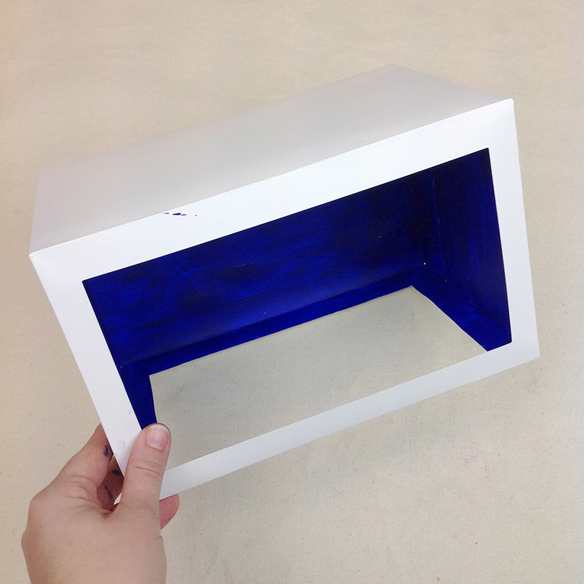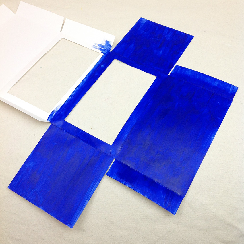 • Step 2Paint the inside of the box around the area you just cut out using CleverPatch™ dark blue acrylic paint. Then paint the two tabs above and below, as well as rest of the right side as shown in the image. Allow to dry.