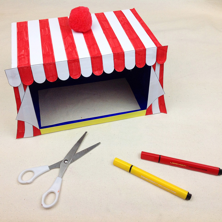• Step 4Print out and colour in the tent BLMs provided, then cut out and attach to the front of the diorama box using double sided tape. You may also like to colour in the top of the diorama box and add a pom pom to make it look more like a circus tent! Adult supervision is recommended when using scissors.