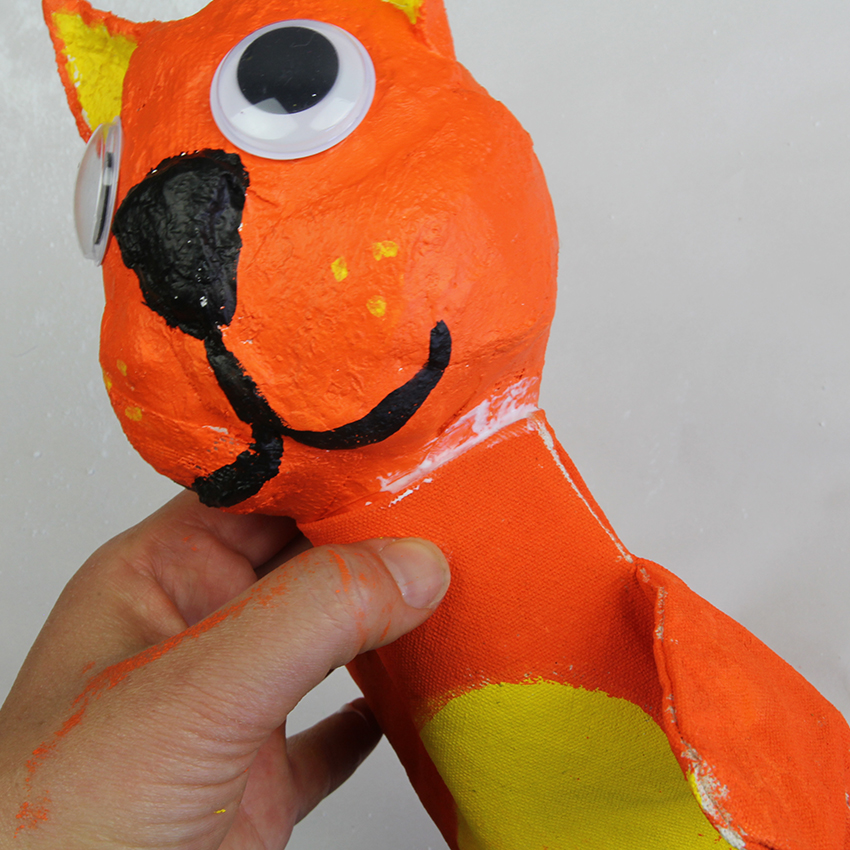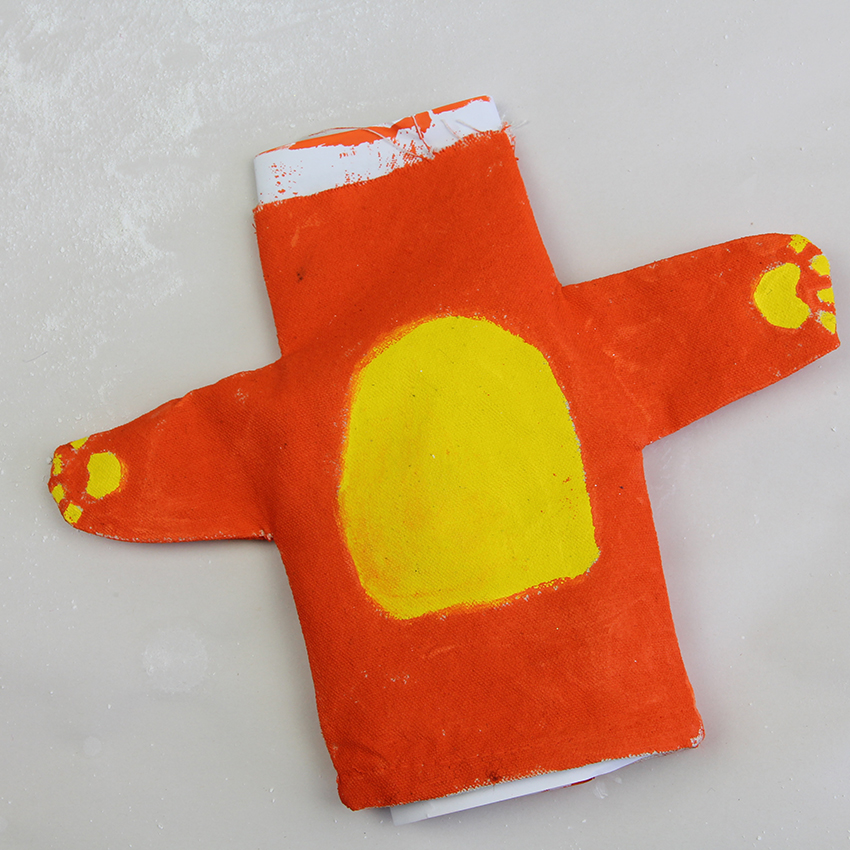 • Step 7Decorate the cotton hand puppet using paint. We are creating a ginger cat, so have painted it orange and added some paws and a belly. Allow to dry.