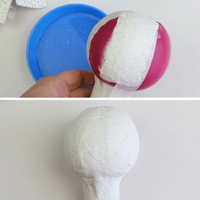 • Step 4Wet your pieces of Mod-Rock one at a time in a bowl of warm water. Squeeze out any excess water and then drape over the balloon. Layer the Mod-Rock over and around the balloon and onto the cardboard roll, making sure to smooth the pieces into each other using your fingers. Continue until the balloon and cardboard roll are completely covered.