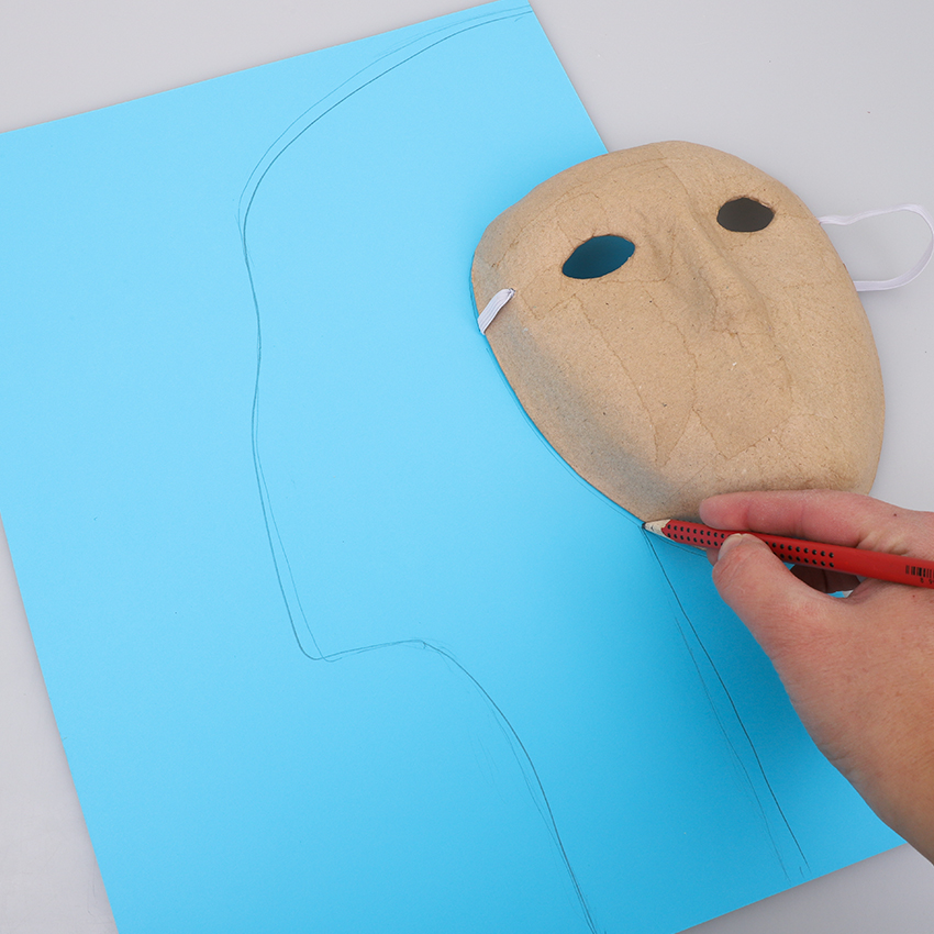 • Step 1Take one sheet of A3 cardboard and place it in front of you in a portrait orientation Position your papier mache mask so it is half over the right edge and slightly closer to the top than bottom of the page. Use a pencil to trace a line around the mask and sketch the shape of Tutankhamun’s headdress around the outside of the mask as shown. Place the mask to the side when complete.