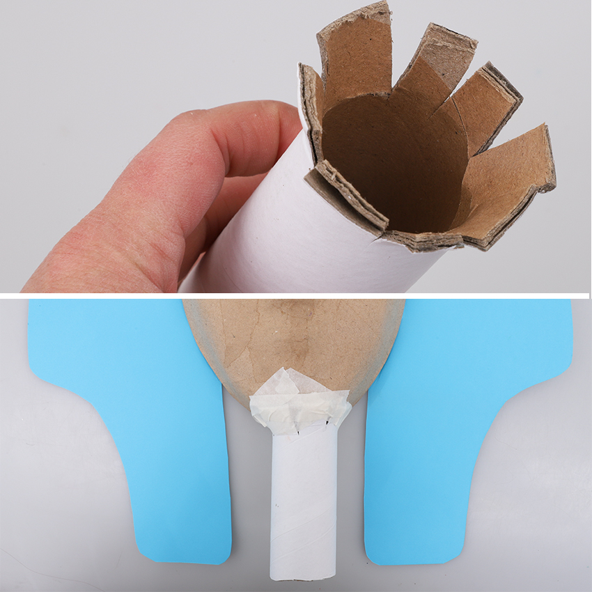 • Step 4Take a cardboard roll and carefully cut slits 2cm long around the top of the roll, approximately 1cm apart. Use your fingers to bend the cardboard tabs outwards as shown. Position at the chin of the mask and secure in place using masking tape.