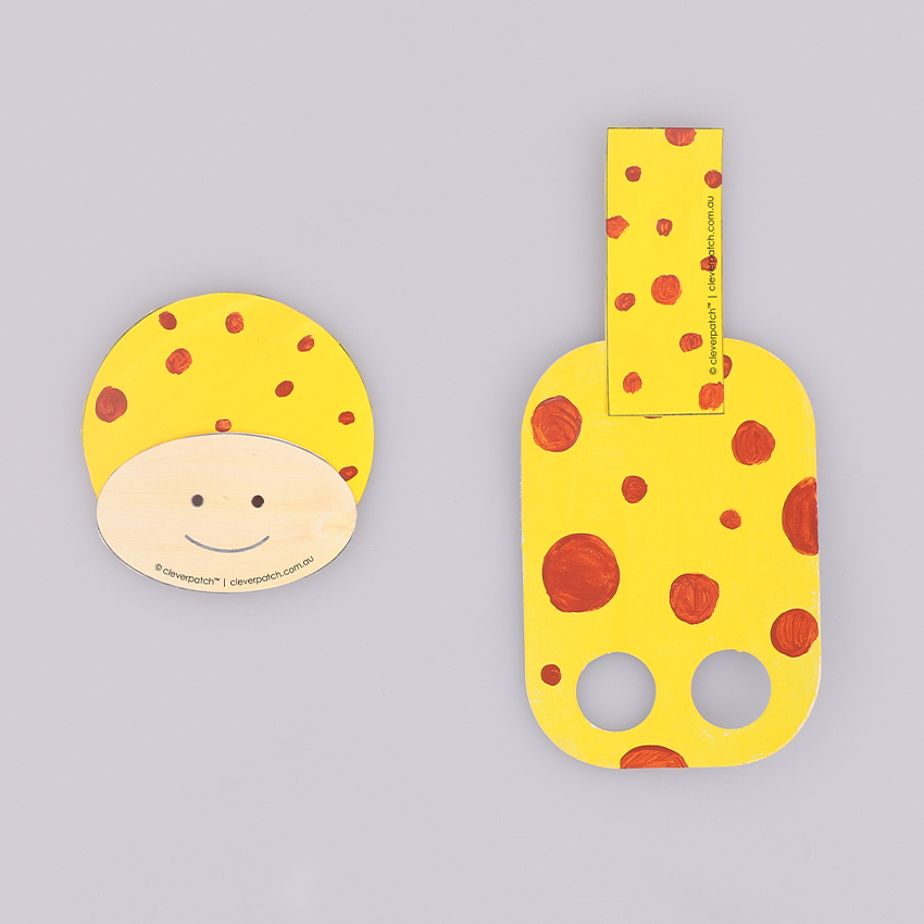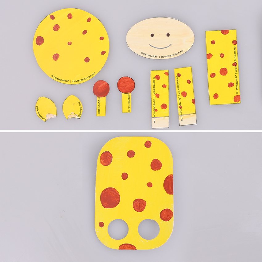 • Step 2Decorate your template and cardboard finger puppet shape using paint. Don’t forget to add the giraffe spots! We chose to mix yellow and white with a bit of the burnt sienna to create a lighter paint for the mouth and nose. Allow to dry. Cut out the template pieces. Adult supervision is recommended when using scissors.