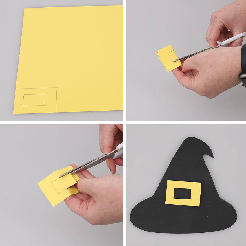 • Step 10Draw a 4 x 6cm rectangle onto yellow cardboard. Add a 2 x 3cm in the centre of the first. Cut out the large rectangle, then fold it in half and make a small cut along the centre rectangle. Unfold the cardboard and continue cutting out the centre rectangle to create a buckle. Flip the buckle over to hide the pencil marks and glue to the centre of the hat. Allow to dry.