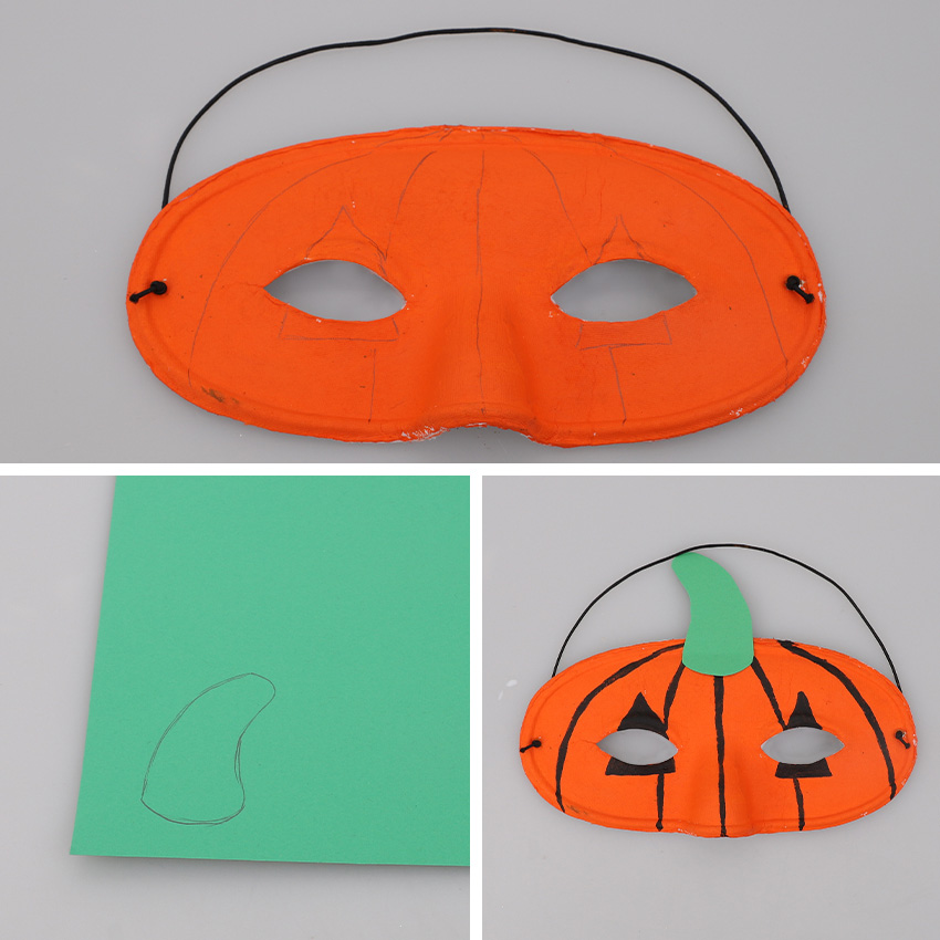 • Step 13Sketch two triangles over the eyes. Add curved lines starting from the top centre of the mask down to the bottom to create the pumpkin’s creases. Paint the triangles and lines with black paint. Allow to dry. Trace and cut out a stem for your pumpkin from green cardboard, using our image as a guide. Glue the stem to the top of the mask, covering the lines where they join in the middle. Allow to dry. Your Pumpkin Mask is now ready to wear this Halloween!