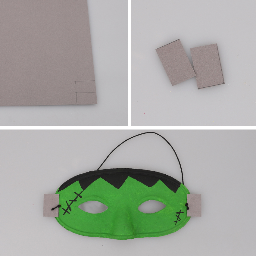 • Step 3Cut out two small rectangles measuring 2 x 3cm from grey cardboard. Adult supervision is recommended when using scissors. Glue one rectangle to each side of the mask next to the holes for the elastic. Allow to dry. Your Frankenstein’s Monster Mask is now ready for monster Halloween!