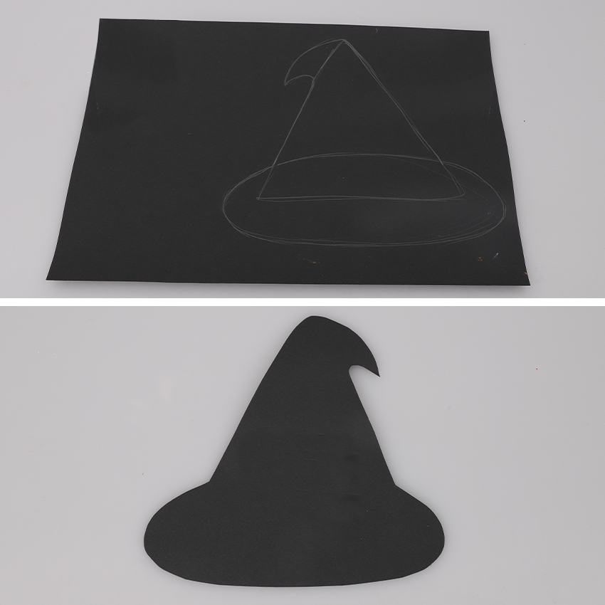 • Step 9On a sheet of black cardboard, sketch an oval about 18cm wide and 8cm high. Draw a triangle overlapping the top of the oval. Draw two curved lines next to the top of the triangle to create a bent hat tip. You can refer to our images as a guide. Cut along the outline to create the Witch’s hat. Flip the hat shape over to hide the pencil lines.