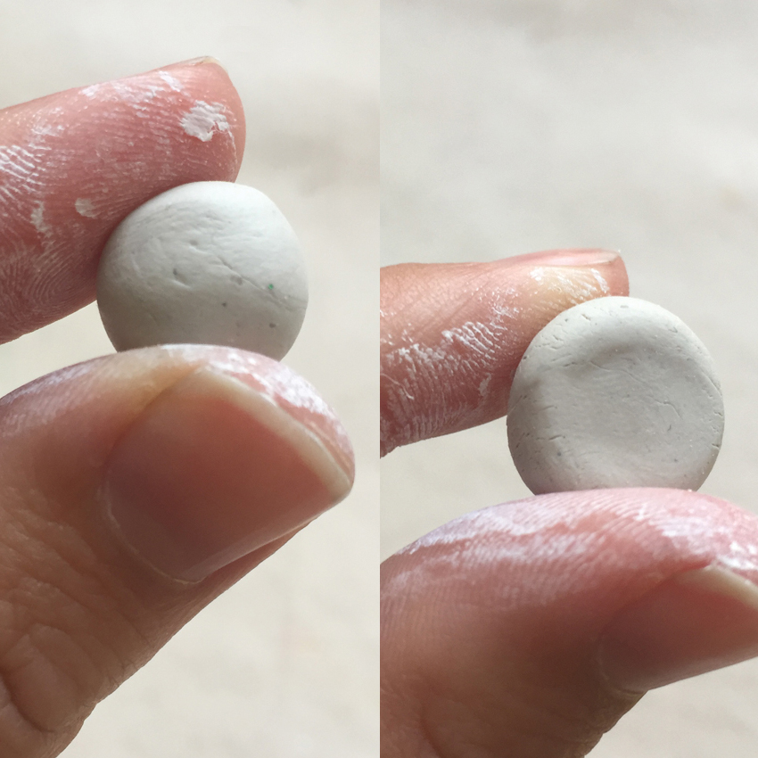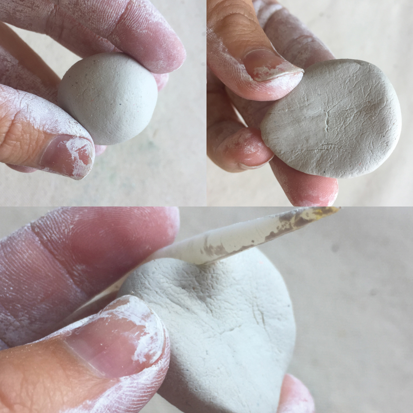 • Step 1 Pinch a small piece of clay in your fingers and roll it to create a ball approximately 1cm. Gently squash the ball between your fingers, flattening it on either side to approximately 5mm thick. You should now have a flat, cylindrical shape.