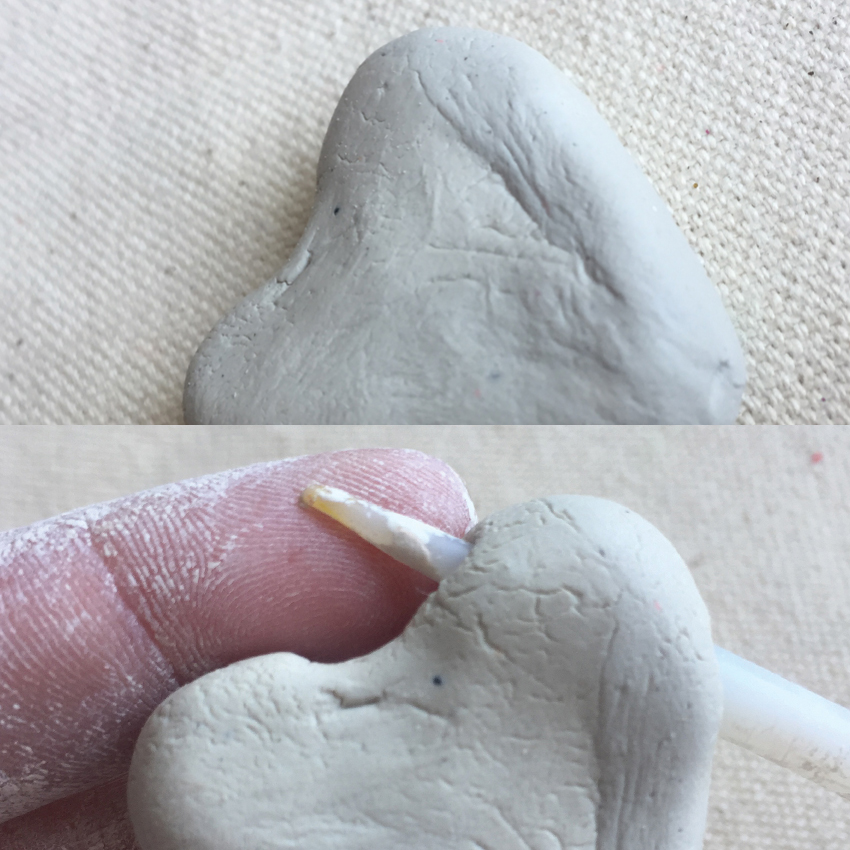 • Step 4 Again, use a plastic tool to pierce a hole into the heart as shown. We pierced through the side and up through one of the hearts top bumps. Be as gentle as possible so as not to warp the shape of the heart. Allow to air dry completely.