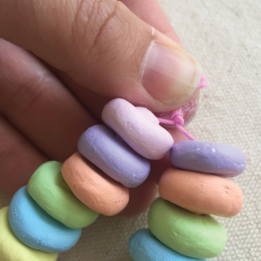 • Step 5 Once the beads are dry, use a small amount of paint to decorate your beads in the colours of a candy bracelet. We’ve used a ratio of approximately 3 parts white paint to 1 part colour to create nice pastel colours. You can make yours as bright as you like. Allow to dry.