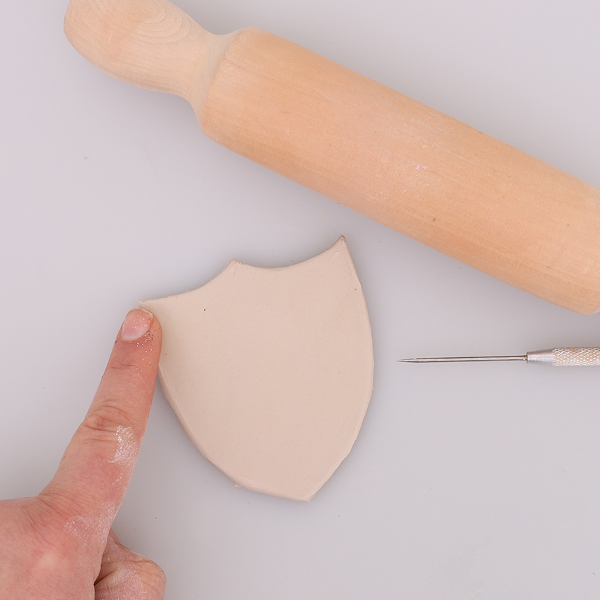 • Step 1Roll your clay into a ball and use a rolling pin to roll it out flat so it’s approximately 4-5mm thick. Use the needle tool from the pottery kit to carve out a crest shape, removing any excess clay from around it. Use your fingers to rub and smooth the edges.
