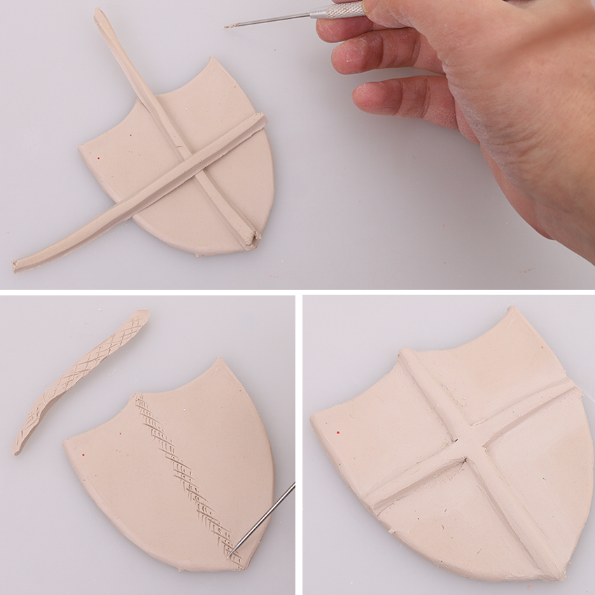 • Step 2Roll out another piece of clay and use the needle tool to cut two long strips. These will need to be long enough to make a cross on your crest as shown. Cut away any excess clay then use a scratch and slurry method to join the strips to the crest. This involves making crosshatch scratches on the surface of the crest and the back of the strip, lightly wetting the scratched surface with some water then pressing the two scratched surfaces together. Press them together firmly and smooth the edges.