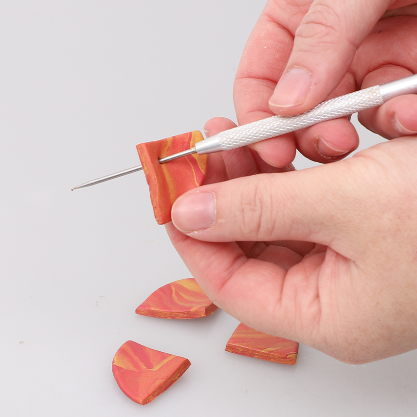 • Step 44. Use the needle tool to poke a hole through the pointed end of the quarter shapes. Alternatively, you could also use a sewing needle, a nail, or a sharp pencil.
