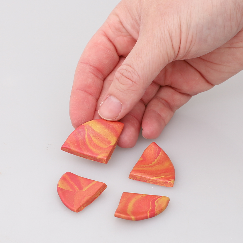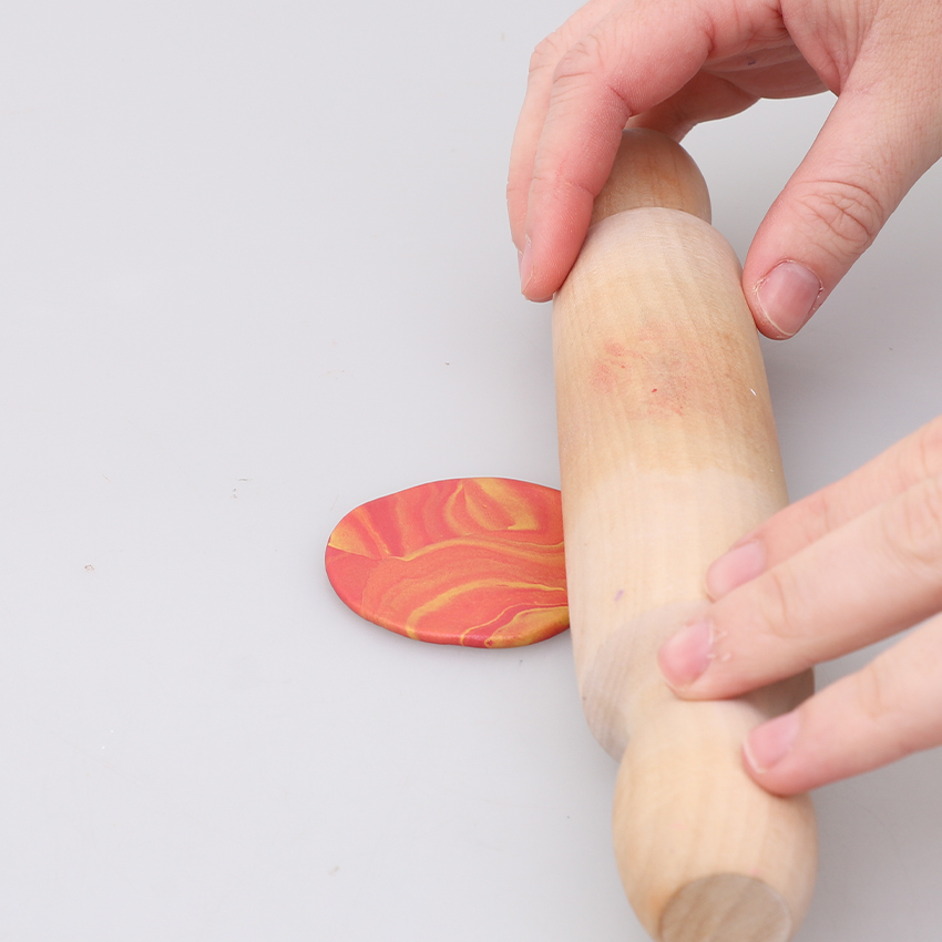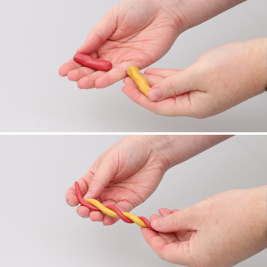 • Step 11. Choose two colours of clay. You will need 5g of each colour (which is half of the colour block in the pack). Knead the clay until it becomes soft. Roll each colour into a log. Twist the two logs together and start to blend the clay. Continue to stretch, twist and roll the clay until you are happy with the marbled effect.