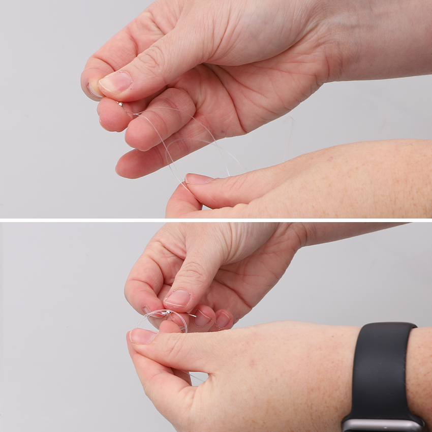 • Step 88. Thread the two ends of line through the first (top) bead and then through the second (bottom) bead. Thread one end of the line through the hole in your clay shape. Thread the other end through the other side of the hole so that the craft line is crossed over.