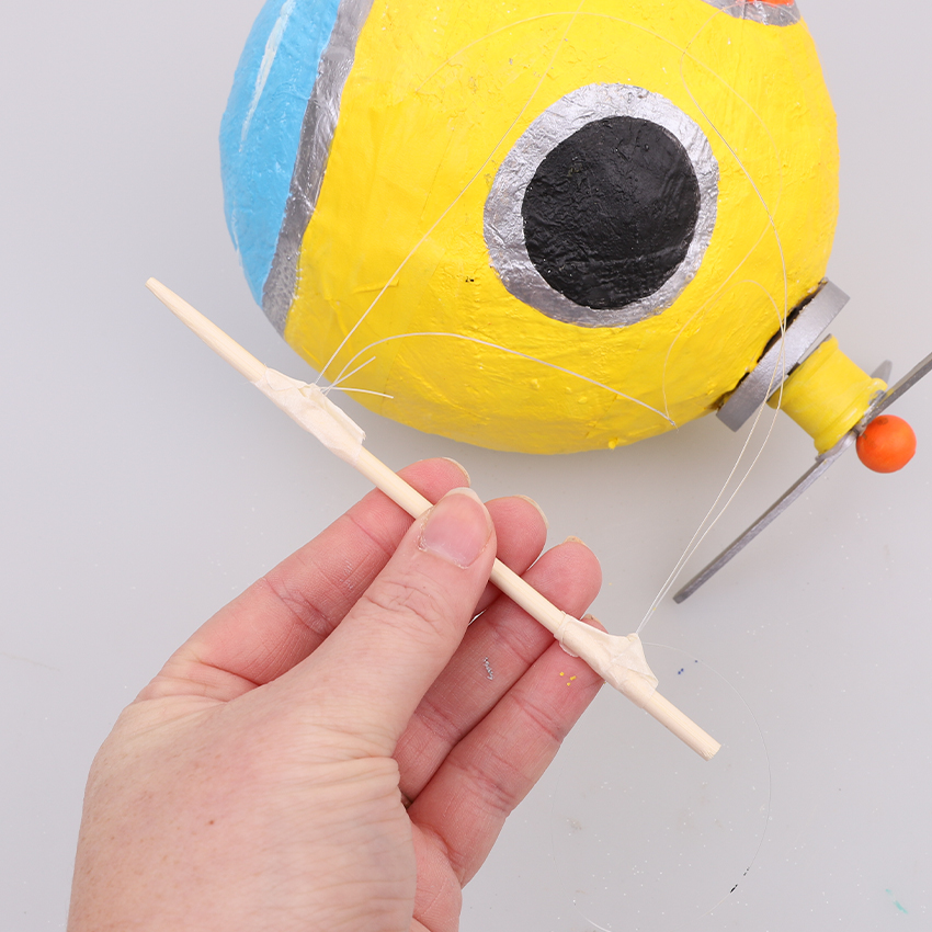 • Step 10Place the two craft line loops onto a wooden scratch board tool so each loop sits on opposite ends of the tool. You may wish to check the lengths again to ensure the submarine sits evenly, making any adjustments as needed. Wrap the tail ends of line around the wood and secure using a small amount of masking tape. This will become a handle and hanger. Peg the wooden handle to a length of string or line to hang in the classroom, or simply hold your submarine by the handle.