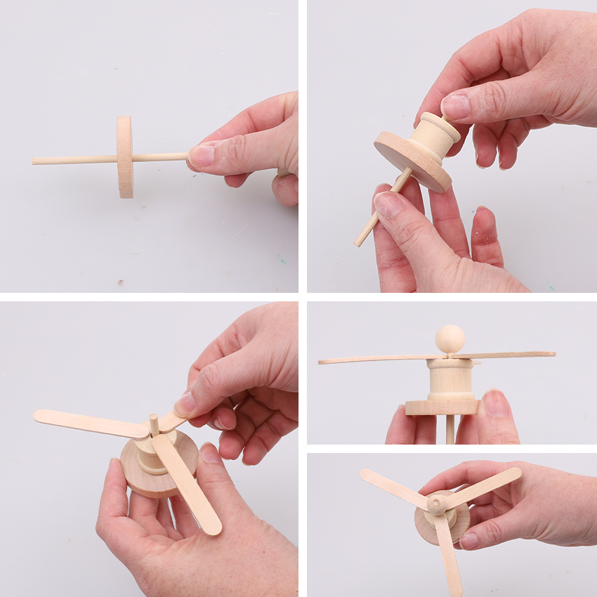 • Step 4Place a wooden wheel onto an axle so it sits 4cm from one end. Place a wooden spool onto the short end. Glue three mini popsticks to the end of the spool as shown using a glue gun, ensuring the glue doesn’t touch the axle. Adult supervision is recommended when using a glue gun. Allow to dry. Place a wooden bead onto the end of the axle so it just sits above the popsticks and the spool can spin freely. Apply glue to the end of the axle and the bead to secure in place and allow to dry.