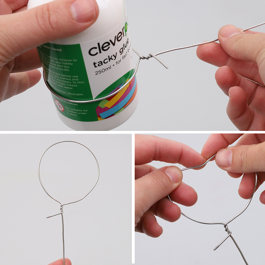 • Step 1Cut four 45cm lengths of armature wire. Adult supervision is recommended when using scissors. Take one piece of wire and wrap an end around the bottle of tacky glue. Twist the short end onto the longer end of wire to create a loop, leaving a small 1cm piece of wire sticking out as shown. Remove the loop from the tacky glue bottle and bend the loop into a petal shape.