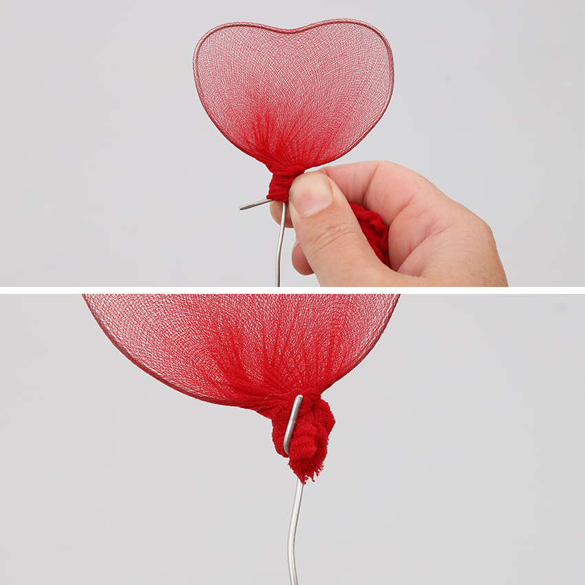 • Step 2Take a red stocking piece and stretch it over the wire petal shape. Pull it firmly downwards and wrap around the base of the petal before bending the small wire end over the stocking to hold in place. Trim the excess stocking.