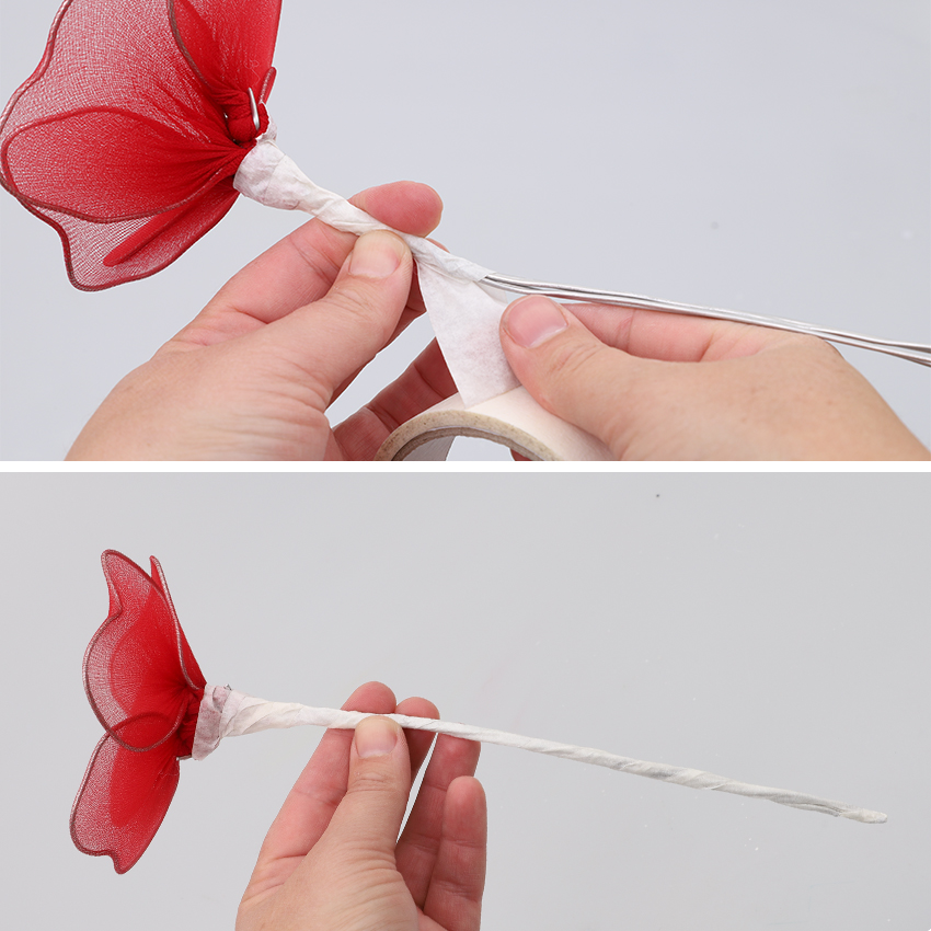 • Step 4Starting from the base of the petals, wrap masking tape tightly around and down the full stem of the poppy, covering the wires.