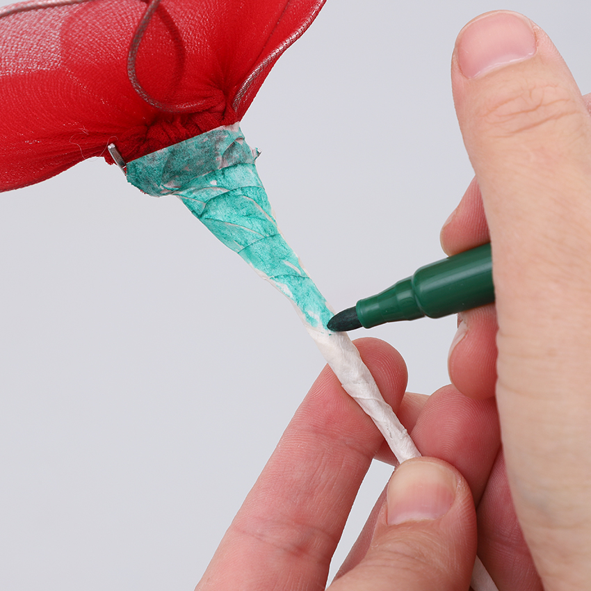 • You can use any colour stocking to cover the wire. Once you’ve made the petals, apply tacky glue over the stocking and allow to fully dry before painting red. Allow the paint to dry.
