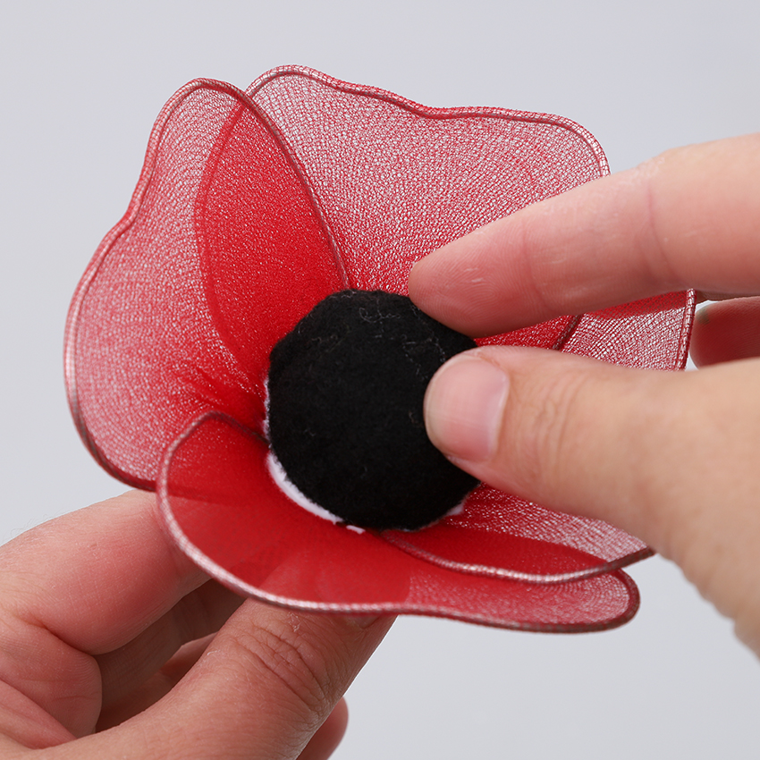• Step 6Finish the poppy by using tacky glue to attach a black pom pom in the centre of the flower. Allow to dry.