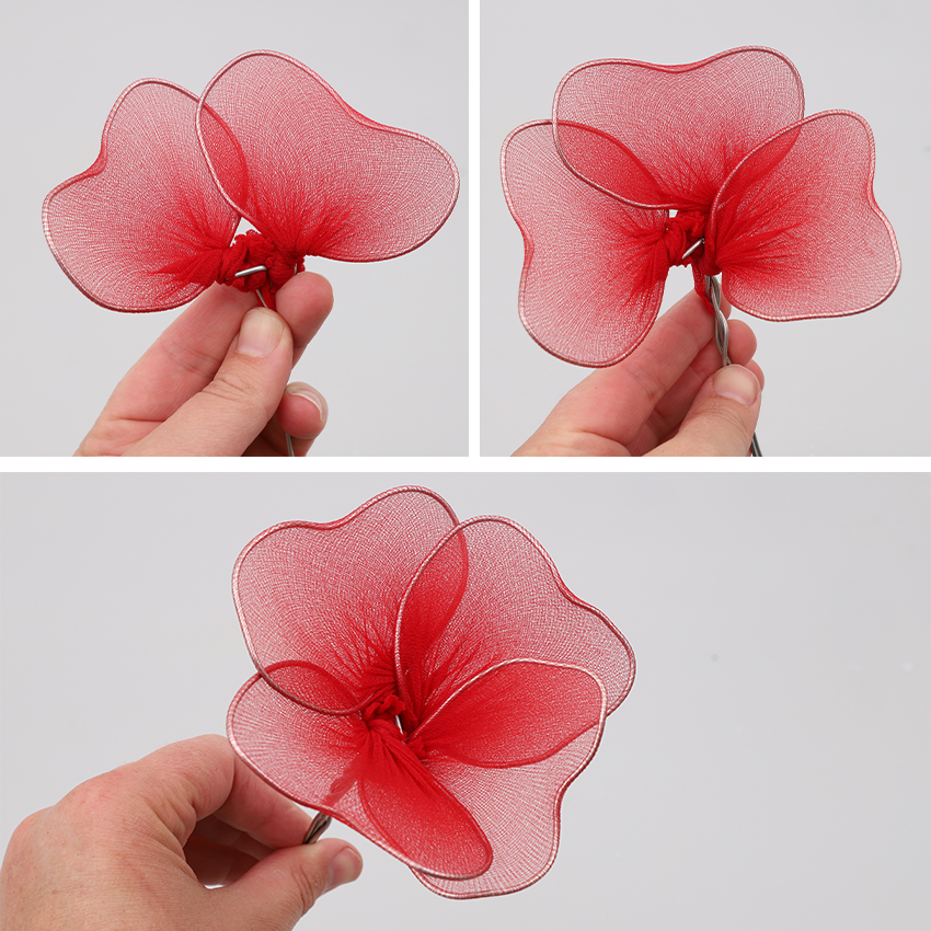• Step 3Repeat steps 1 and 2 to create four petals. Begin to assemble the poppy by adding one petal at a time and wrapping the wire stems around each other to hold in place. Once they are all joined you can do any adjustments as the wire is pliable.