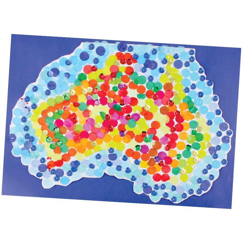 • Step 3Glue green, yellow, red and pink confetti to cover Australia. Allow to dry.