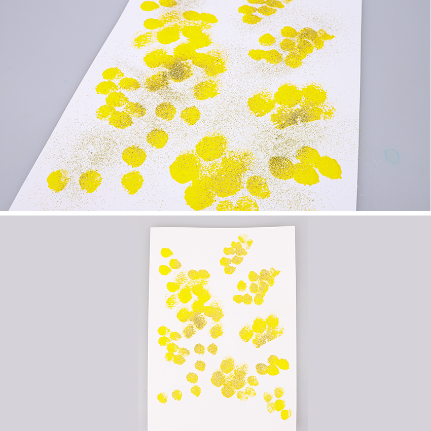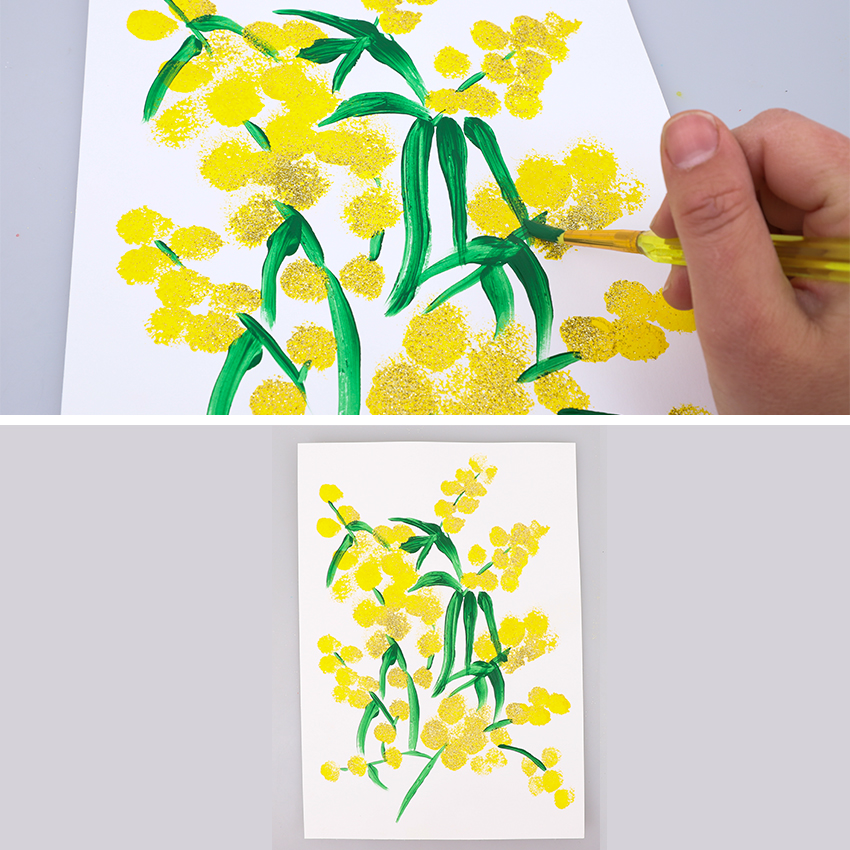 • Step 2While the yellow paint is still wet, add a touch of sparkle to your design by sprinkling some gold glitter over the top of some or all of your wattle blooms. Tap off any excess glitter and allow to dry.