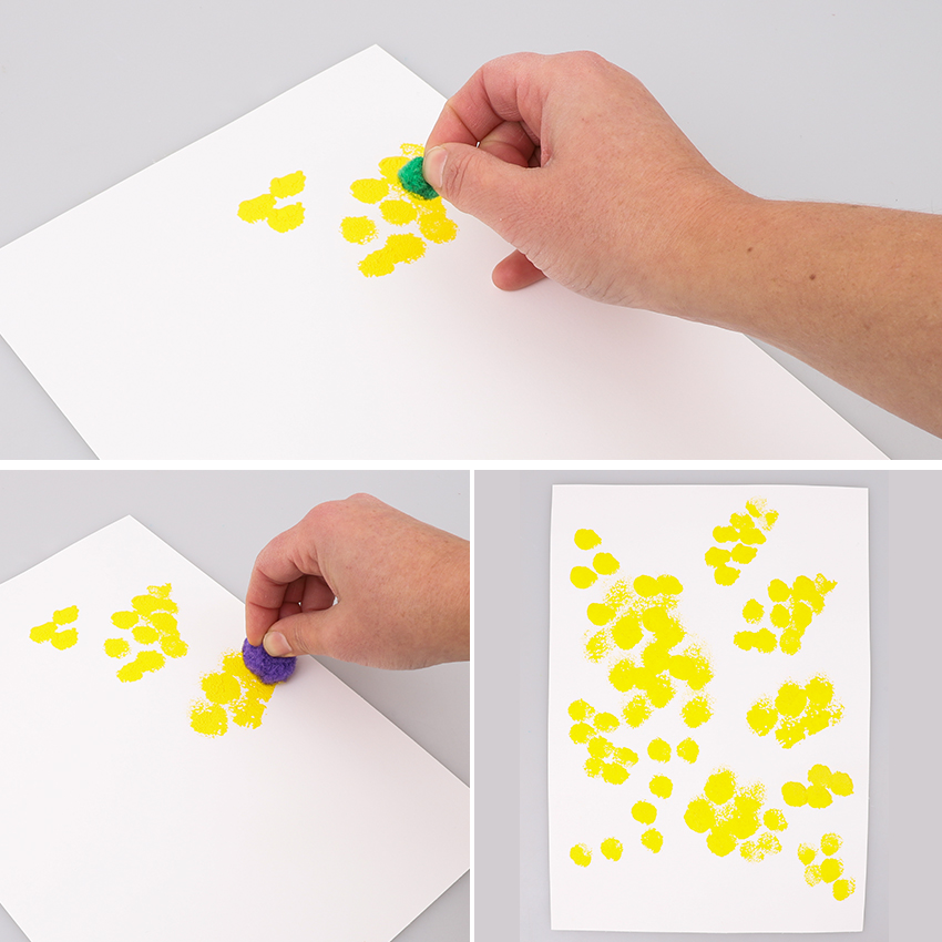 • Step 1Pom poms make great ‘paint brushes’ when creating a Wattle Day artwork. Simply choose a couple of different sized pom poms ready to use. Dip a pom pom into the yellow paint and begin to dab it onto a piece of A4 white cardboard. Think about the way the little yellow wattle blooms cluster together. Continue dabbing with your different sized pom poms until you are happy with your design.