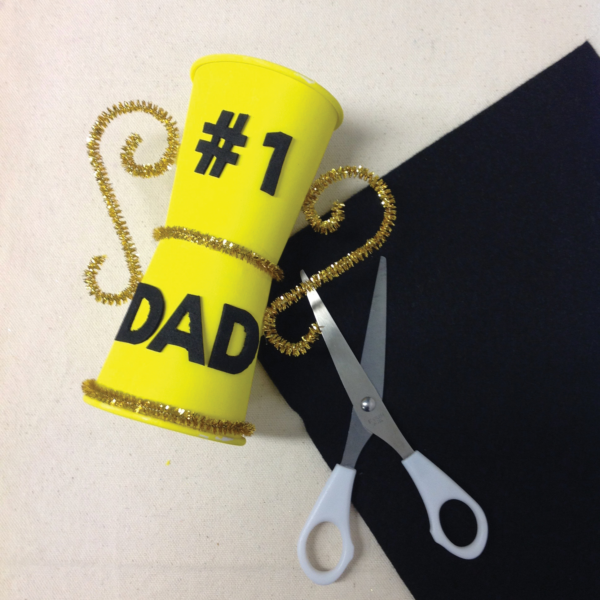 • Step 4 Use a glue gun to attach the two handles to either side of your paper cup trophy. Adult supervision is recommended when using a glue gun. Allow to dry. You may also like to add chenille stems around the bottom and centre of your trophy like we have.