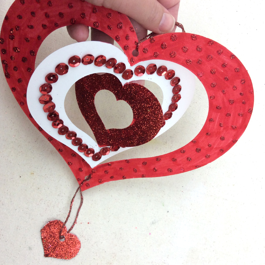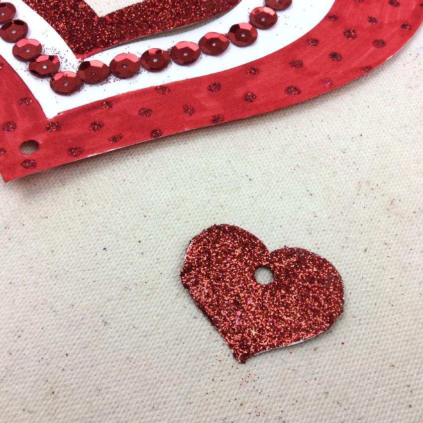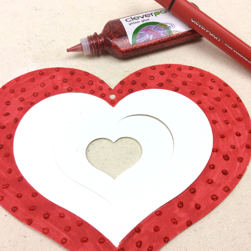 • Step 1Pop out the 3D heart including the full heart at the centre. Colour the outside heart in red marker, then use glitter glue to add a simple polka dot pattern. Allow to dry and then repeat the process on the other side.