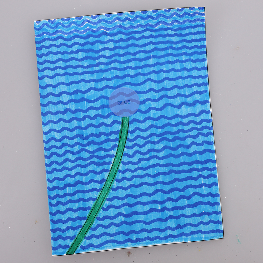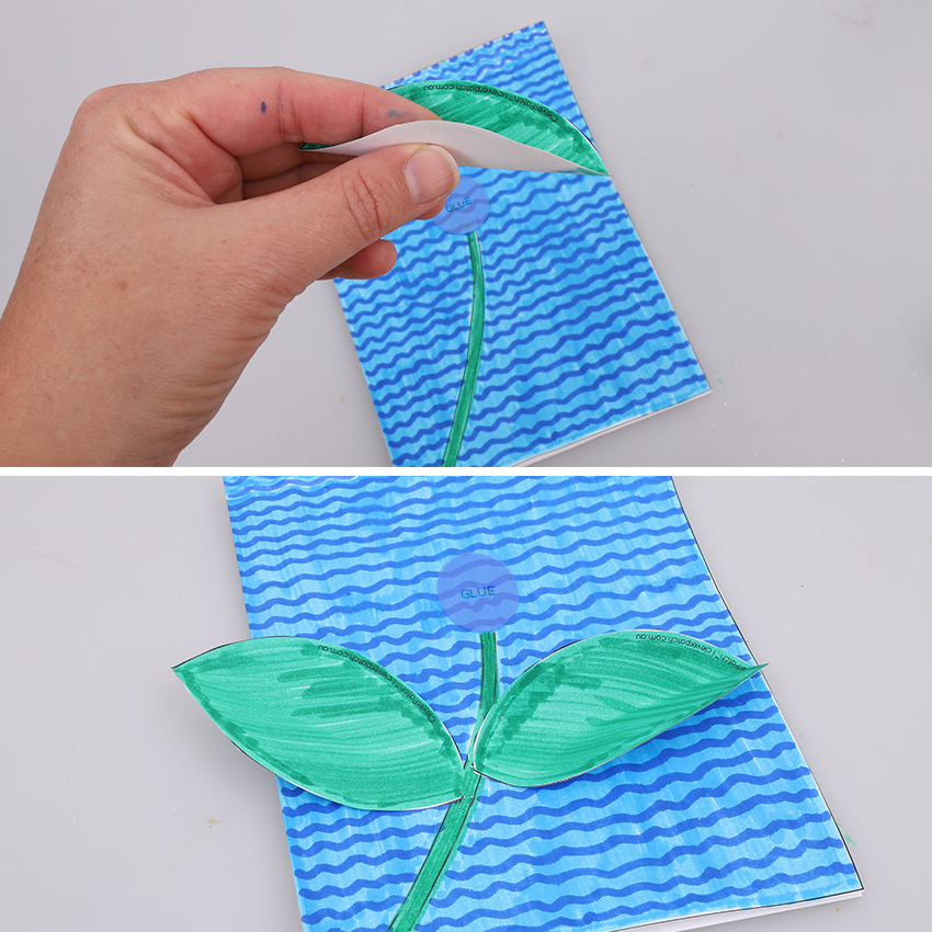 • Step 3Fold the leaf shapes in half lengthwise. Apply a small amount of glue on one end of the leaf and place on the front of the card near the stem line, so it sticks up slightly. Repeat with the other leaf on the other side of the stem. Allow to dry.