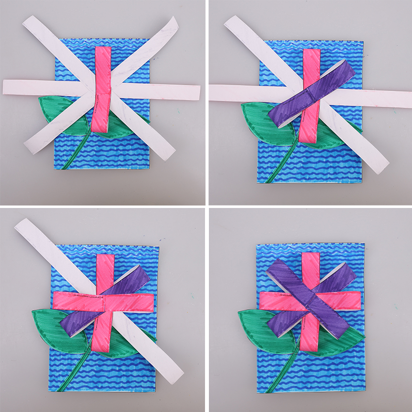 • Step 5. Add more glue to the middle of the strips where they all intersect. Bring the ends of the vertical strip into the middle and glue them down in place, creating two loops. These are the first petals! Add more glue to the middle and move clockwise to the next strip. Bring the ends of the strip in and glue down to create two more petals. Repeat this process until all the petals have been completed. Allow to dry.