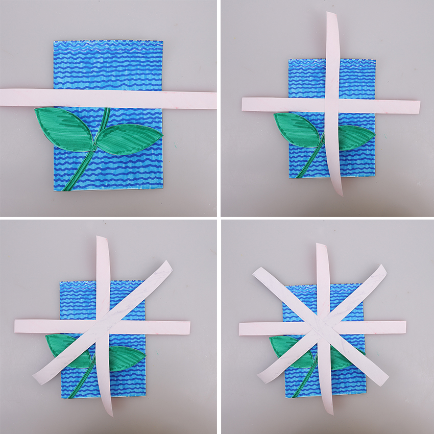 • Step 4Add glue to the circle on the front of the card and press your first template strip down horizontally. Ensure your design on the strip is facing down, and the dot is under the middle of the strip. Add more glue on top of this first strip, just in the middle where the circle lies underneath. Press the second strip on vertically so the strips form a cross. Repeat this process two more times to glue down the remaining two strips, this time aligning them in a ‘x’ shape. Allow to dry.