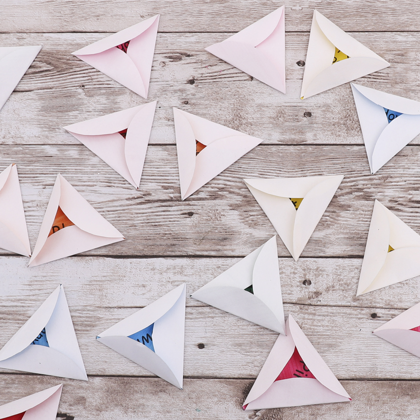 • Step 4Valley fold the sides of each circle along the dotted lines, turning your circles into triangles with tabs.