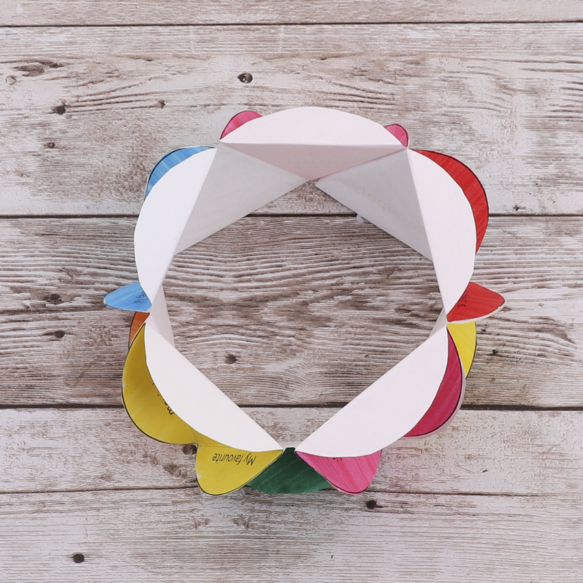 • Step 7To create the middle section, you need to glue the remaining triangles into a straight line. Alternate the direction the triangles face so that the triangles line up and make a straight edge along the top and bottom. Once the line is complete, glue the end tabs together to create a ring. Allow to dry.