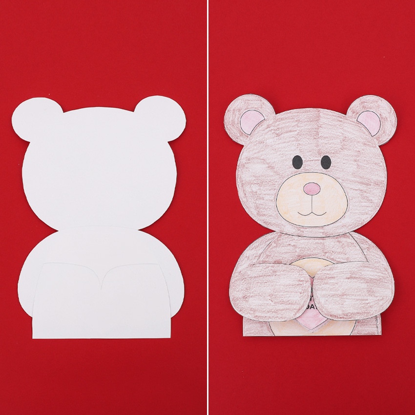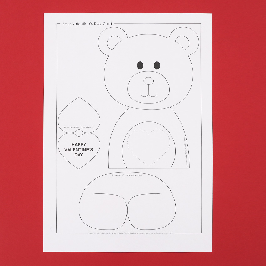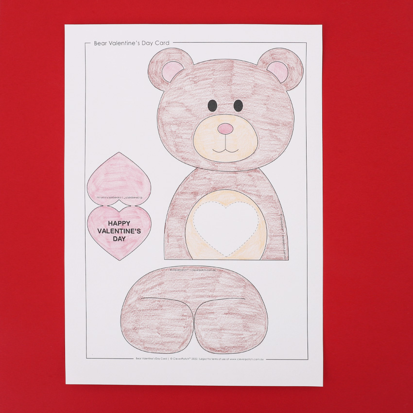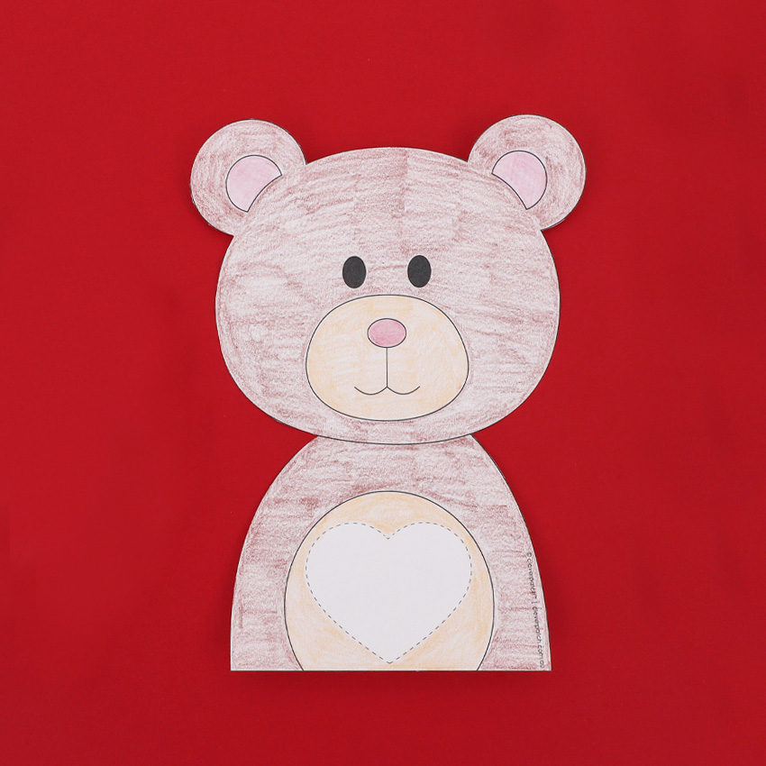 • Step 4Cut out the hearts, then fold in half so that the printed message is on the outside of the hearts. Don’t forget to cut out the diamond shape between the two hearts as well! Place glue on the back of the hearts, then stick onto the dotted line heart on the bear’s tummy. Allow to dry. Write a message on the inside of the hearts.