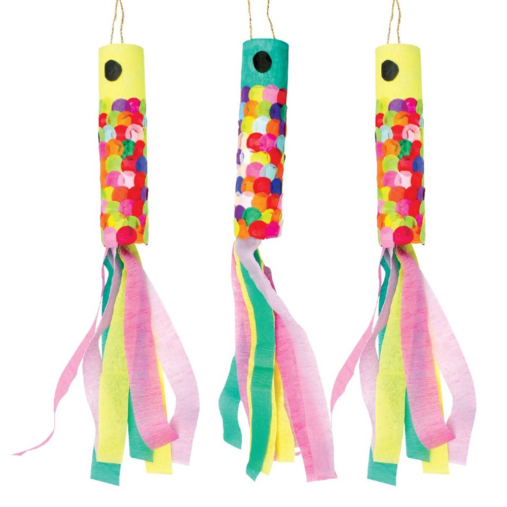• Step 6Cut a piece of metallic yarn (20cm long) and tape the loose ends to the inside top of the cardboard roll. Hang your Koi fish around the classroom for a bright display!