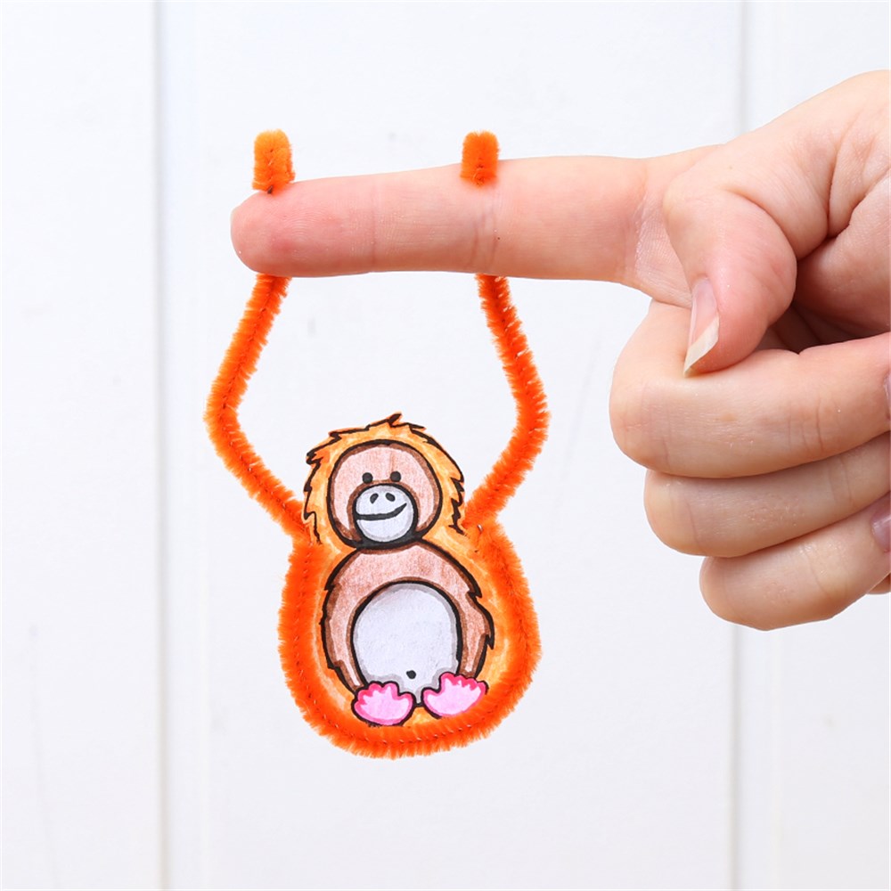 • Step 4Attach the chenille stem to the back of your Orangutan using glue. Allow to dry. Fold both ends of the U shaped chenille stem around your finger so that it looks as though the Orangutan is holding onto you.