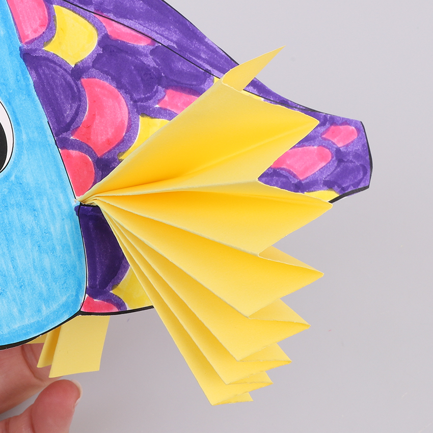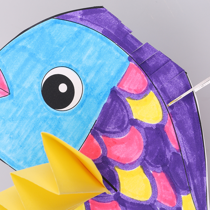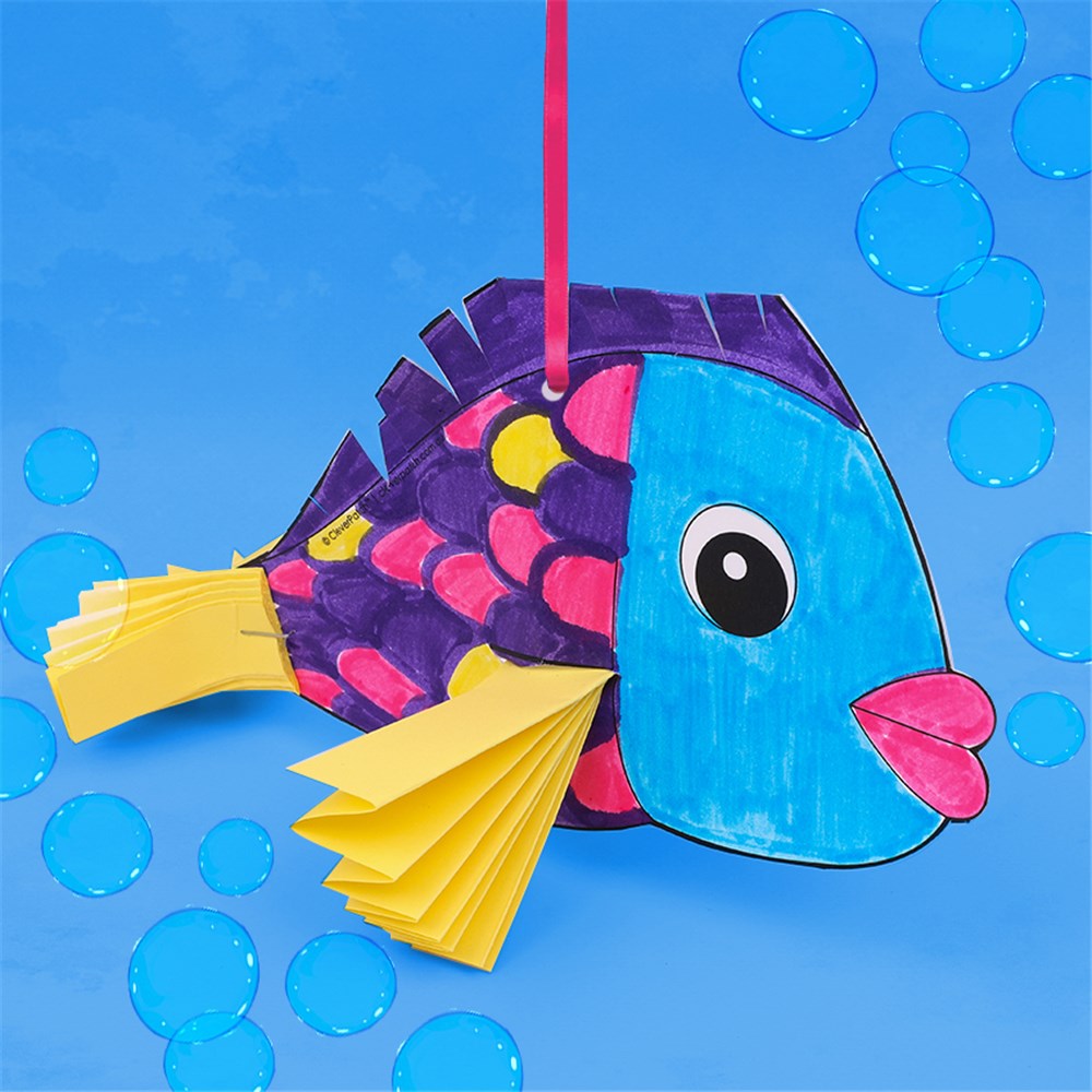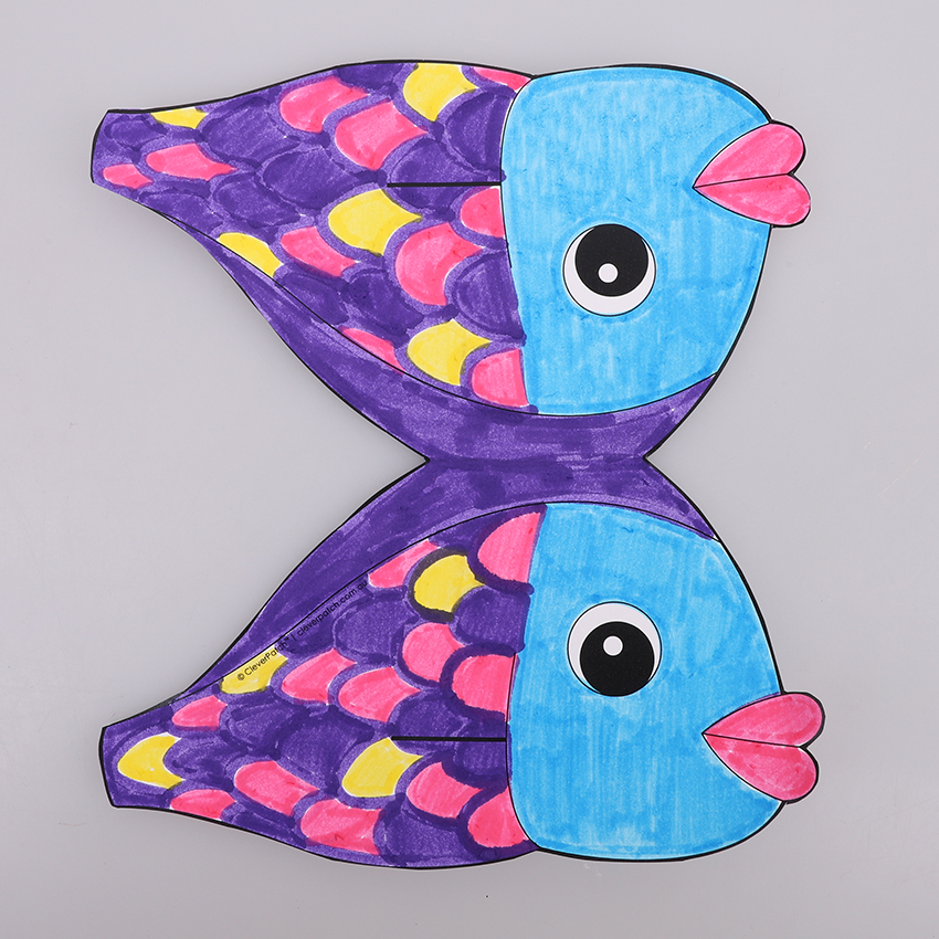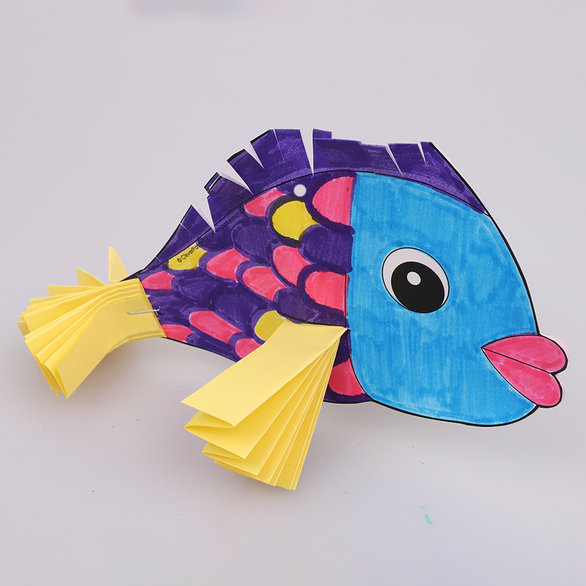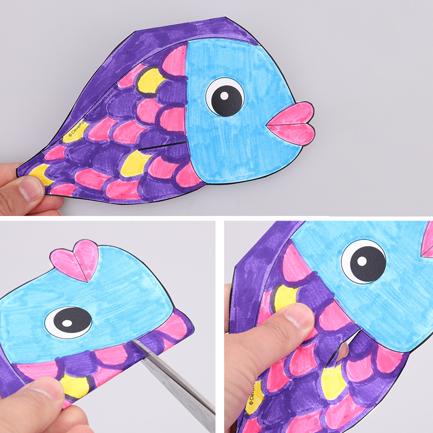 • Step 1Download and print the template provided. We recommend printing onto cover paper as this provides sturdiness when assembling your fish. Decorate your template with markers or pencils and cut along the thick outer line using scissors. Adult supervision is recommended when using scissors.