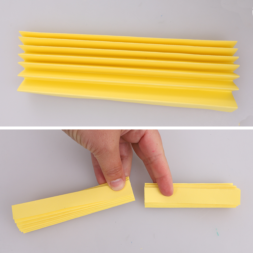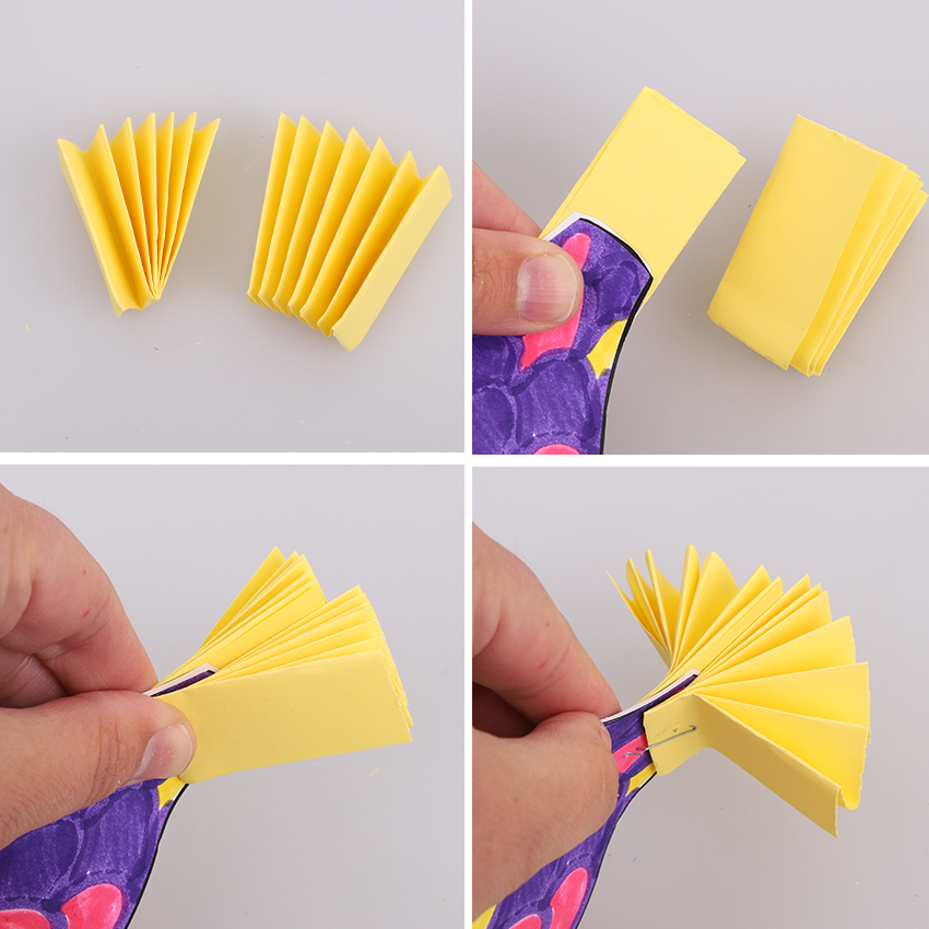 • Step 3Choose a coloured piece of A4 paper and make an accordion fold along the short edge. Make each fold approximately 1cm wide and continue all the way down the length of the paper. Once completely folded, cut the paper so you have a 12cm long piece and a 9cm long piece.