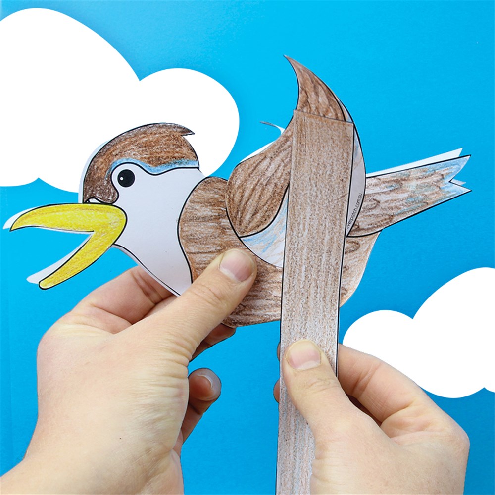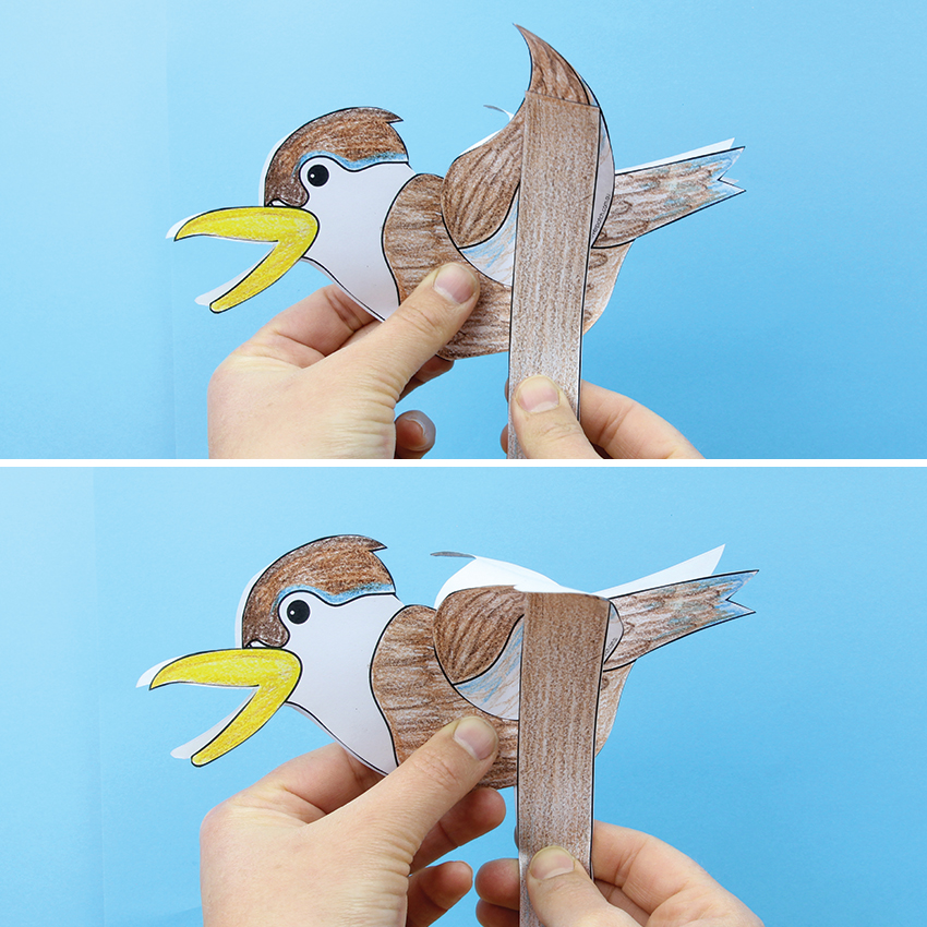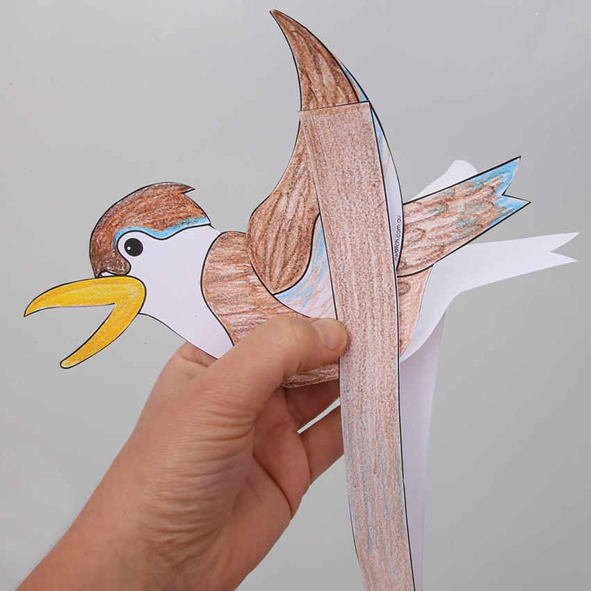 • Step 5Hold the Kookaburras body in one hand and take hold of the strips of paper in your other hand. Gently pull up and down on the strips to bring the wings up and down - Your Kookaburra is now flying!
