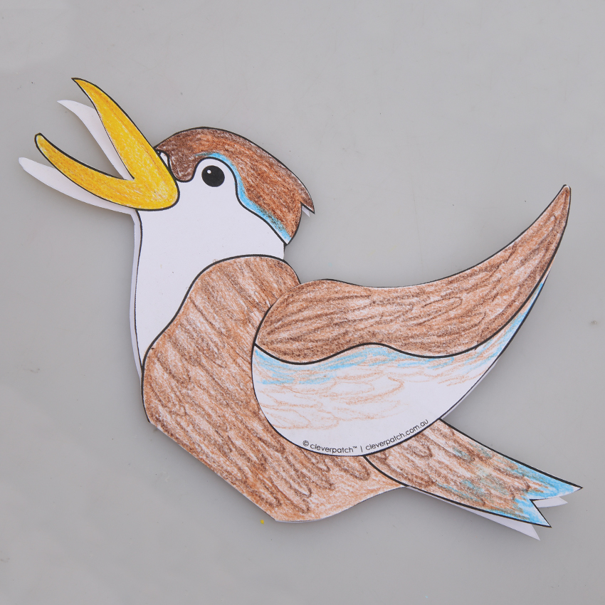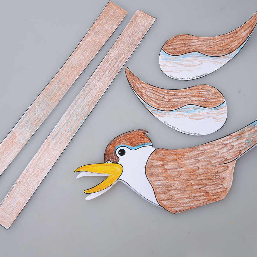 • Step 2Decorate the templates. We have used coloured pencils, but you could also use markers or paints. Allow to dry if needed. Carefully cut out each of the pieces and fold the Kookaburra body in half along the dotted line. Adult supervision is recommended when using scissors.