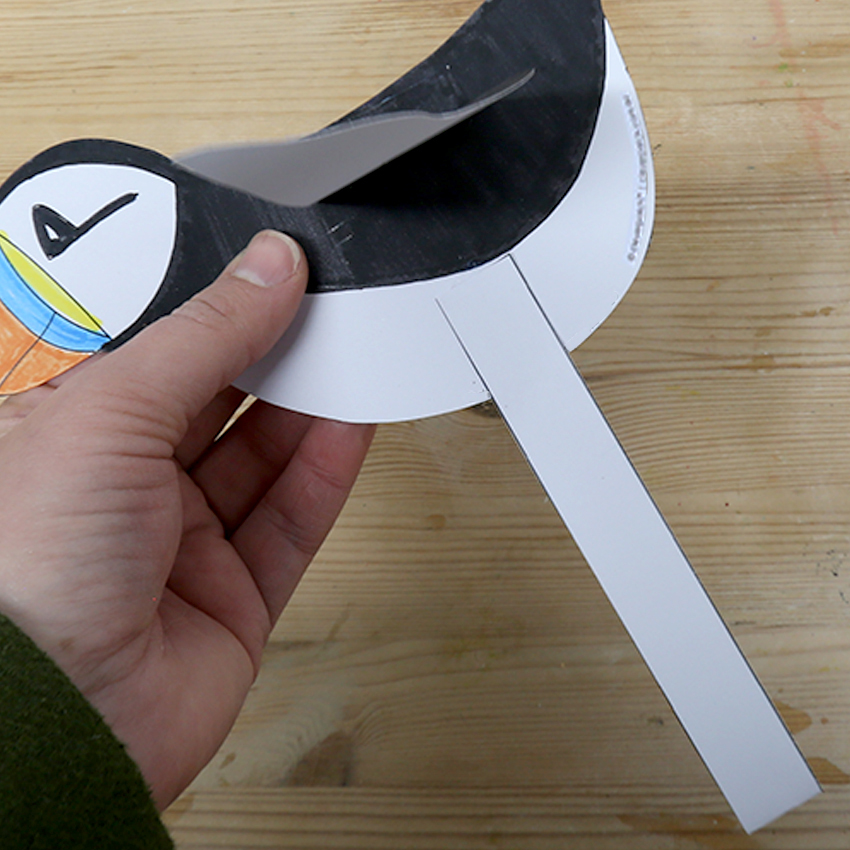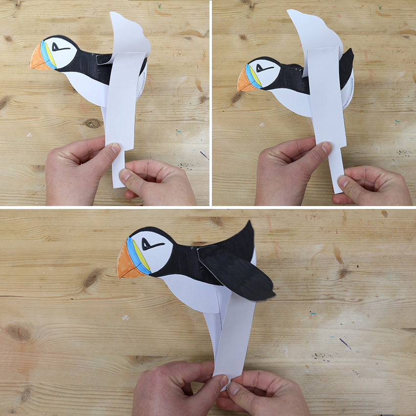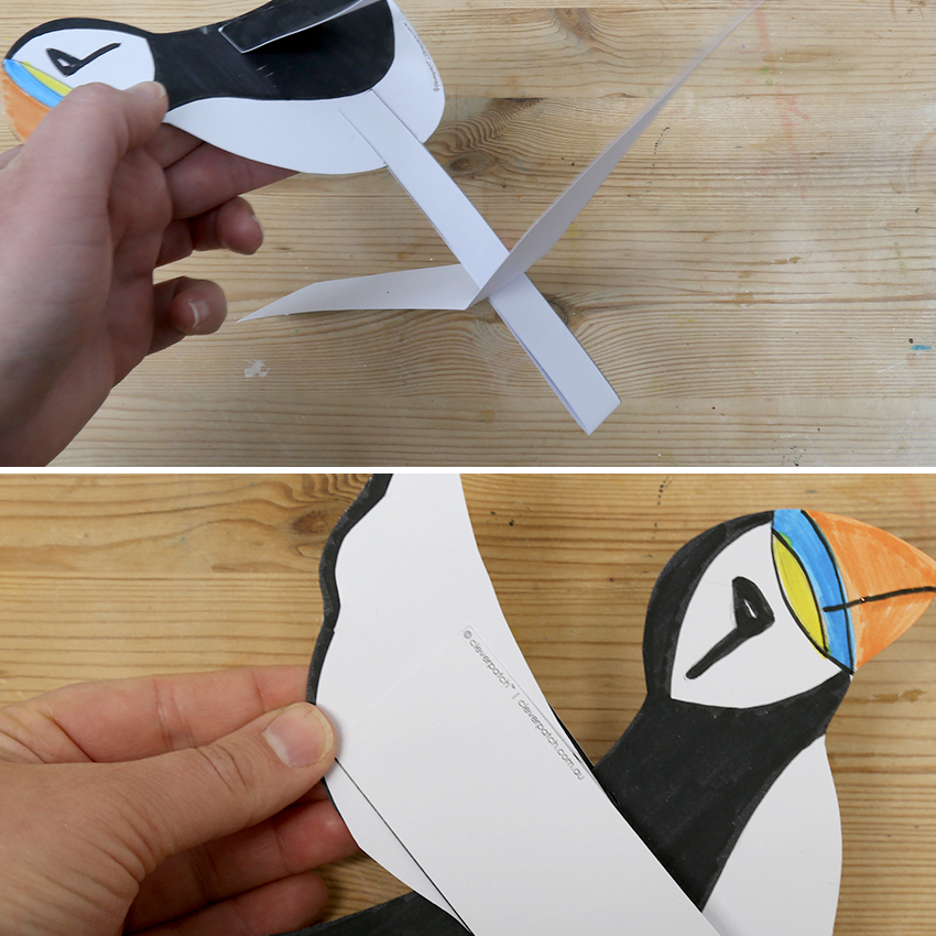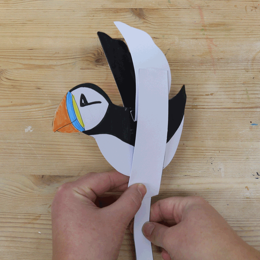 • Step 7Your Puffin is now ready to fly! Hold the thin strip in one hand and gently move the wide strip up and down to move the Puffin’s wings.