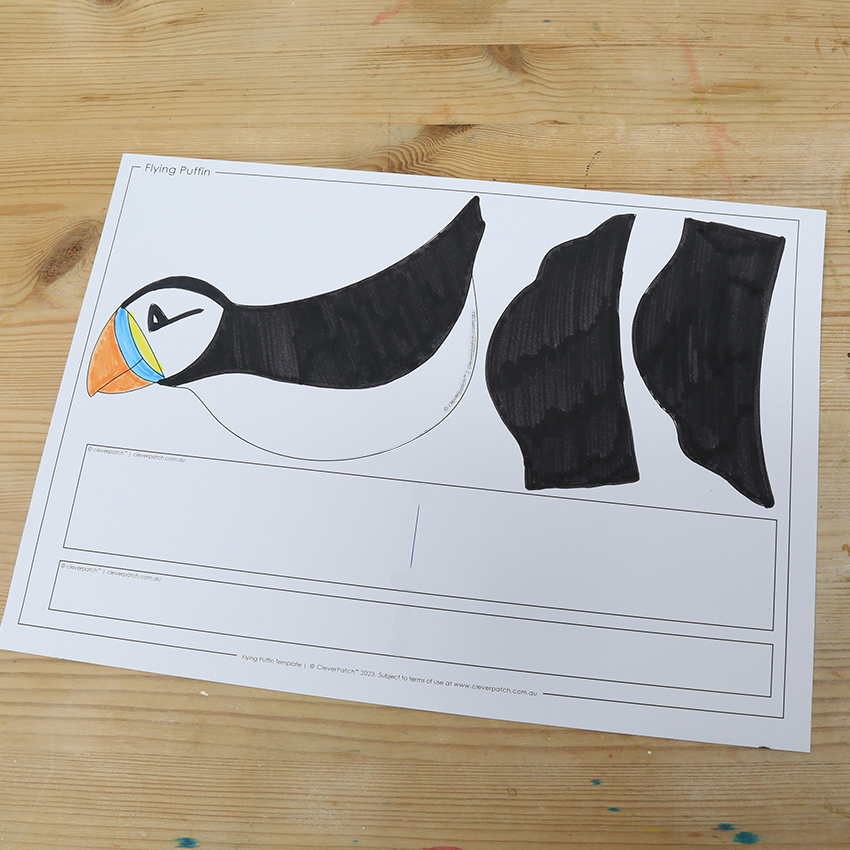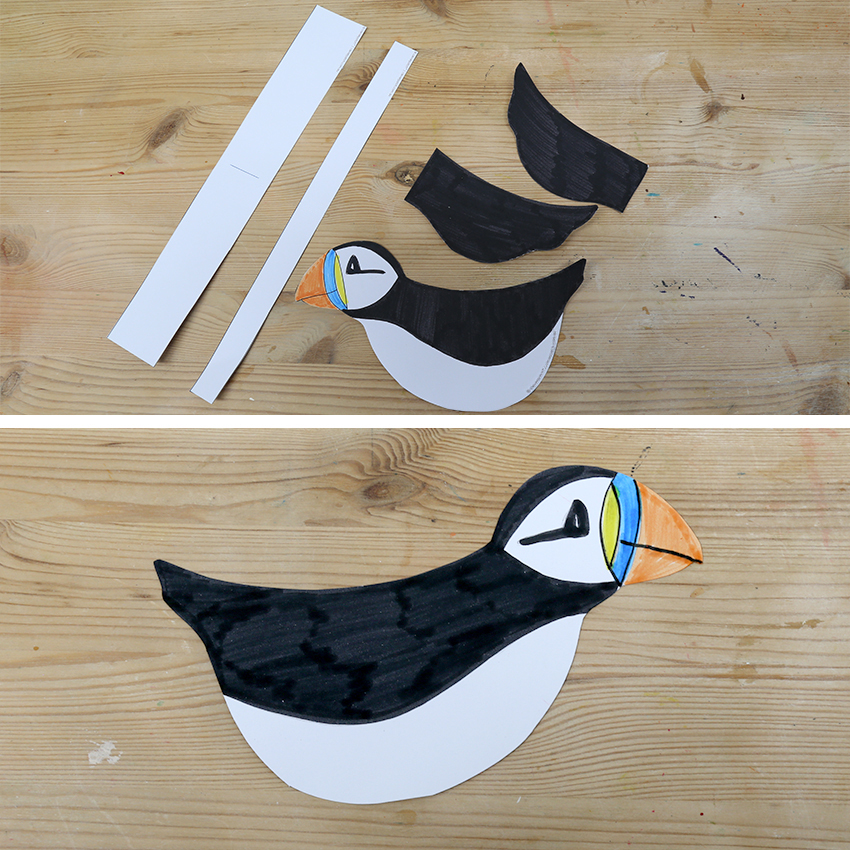 • Step 1Download and print the template provided onto cardboard as this makes for sturdy construction of your puffin. Decorate the template using coloured markers.